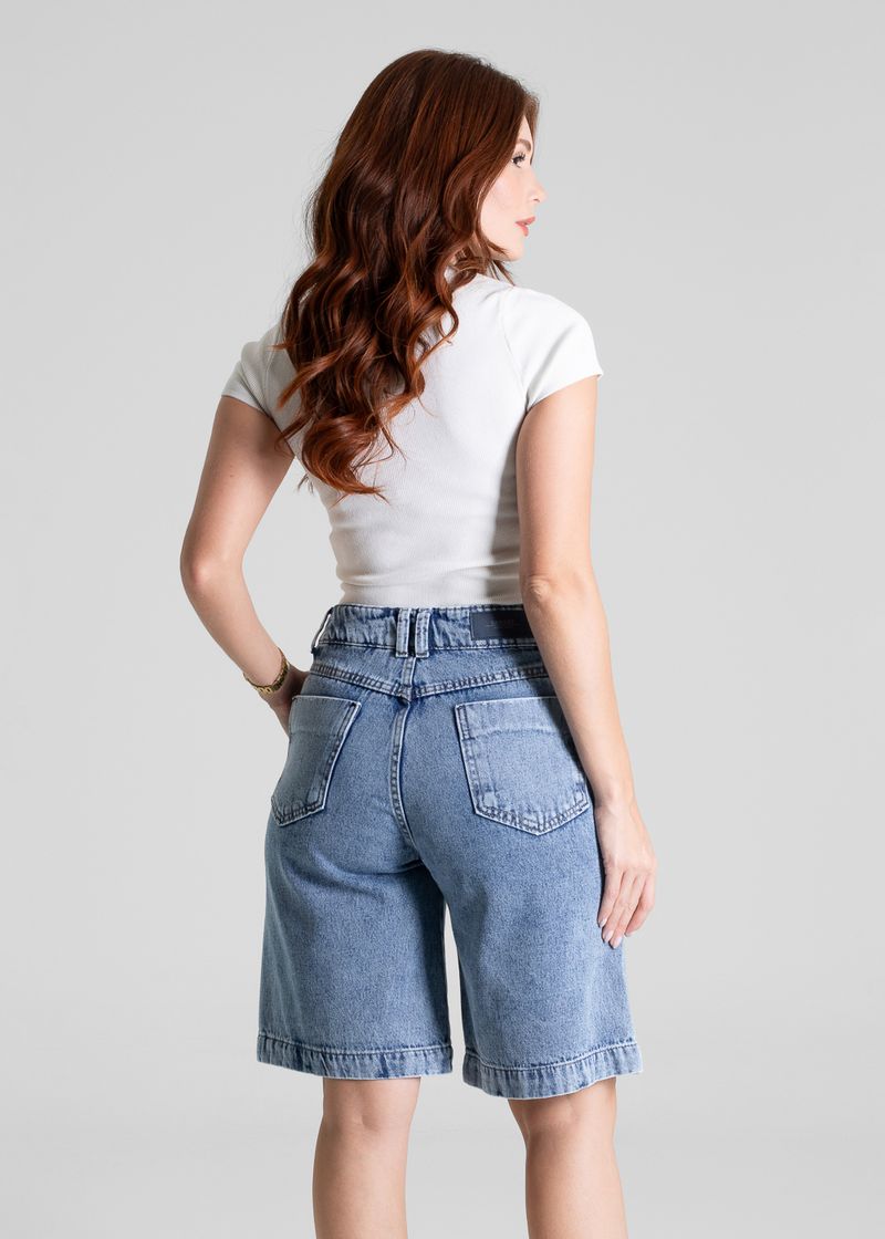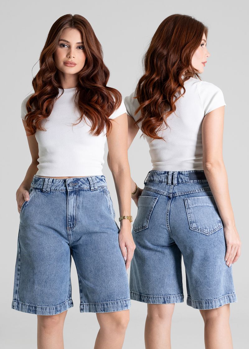 Bermuda confeccionado em jeans. Modelagem moderna e confortável para todas as ocasiões. Cintura alta Fechamento com botão e zíper Bolsos frontais e posterior funcionais Barra simples Tecido: Jeans Tipo de lavagem: Azul Cor: Azul claro