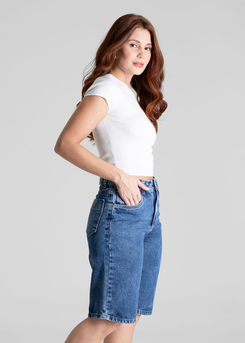 Bermuda confeccionado em jeans. Modelagem moderna e confortável para todas as ocasiões. Cintura alta Fechamento com botão e zíper Bolsos frontais com leves puidos posterior funcionais Barra simples Tecido: Jeans Tipo de lavagem: Azul Cor: Azul médio