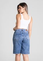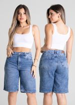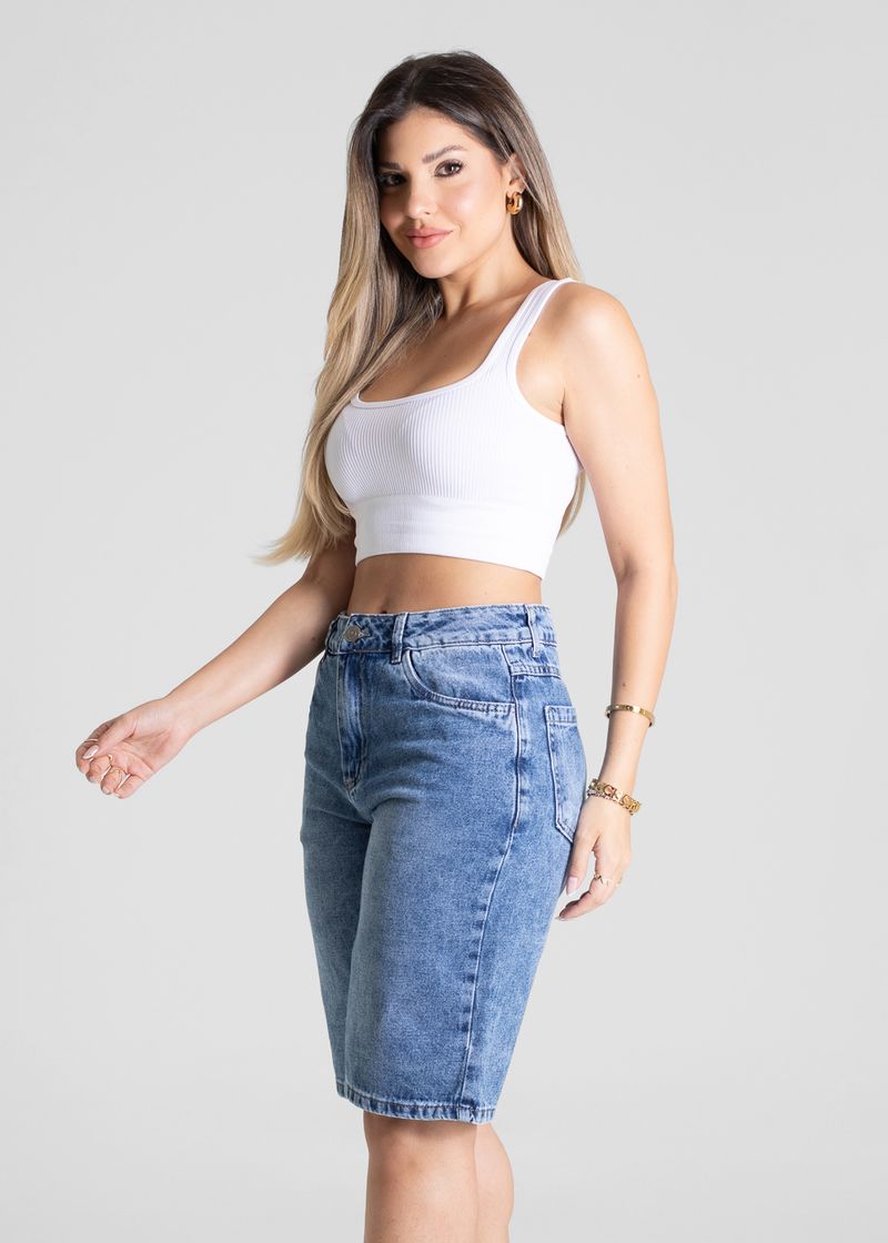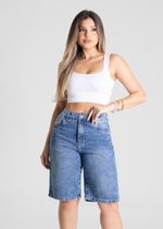 Bermuda confeccionado em jeans. Modelagem moderna e confortável para todas as ocasiões. Cintura alta Fechamento com botão e zíper Bolsos frontais com leves puidos posterior funcionais Barra simples Tecido: Jeans Tipo de lavagem: Azul Cor: Azul médio