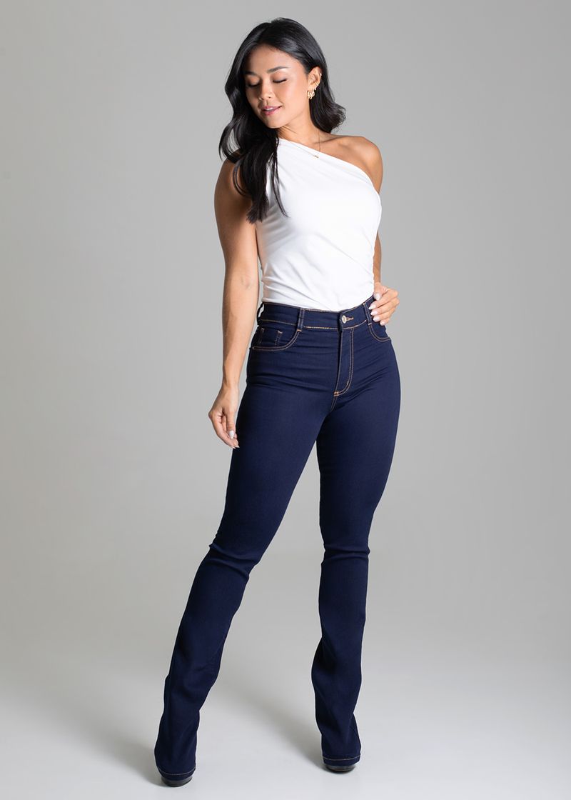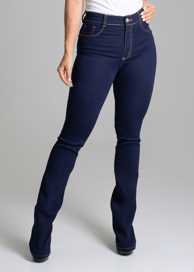 Modelo boot cut caimento mais justo nas pernas com barras mais abertas. Bolsos frontais falsos e traseiros funcionais Fechamento com botão e zíper com passantes Tecido: jeans Botão de metal Barra basica Tipo de Lavagem: azul