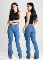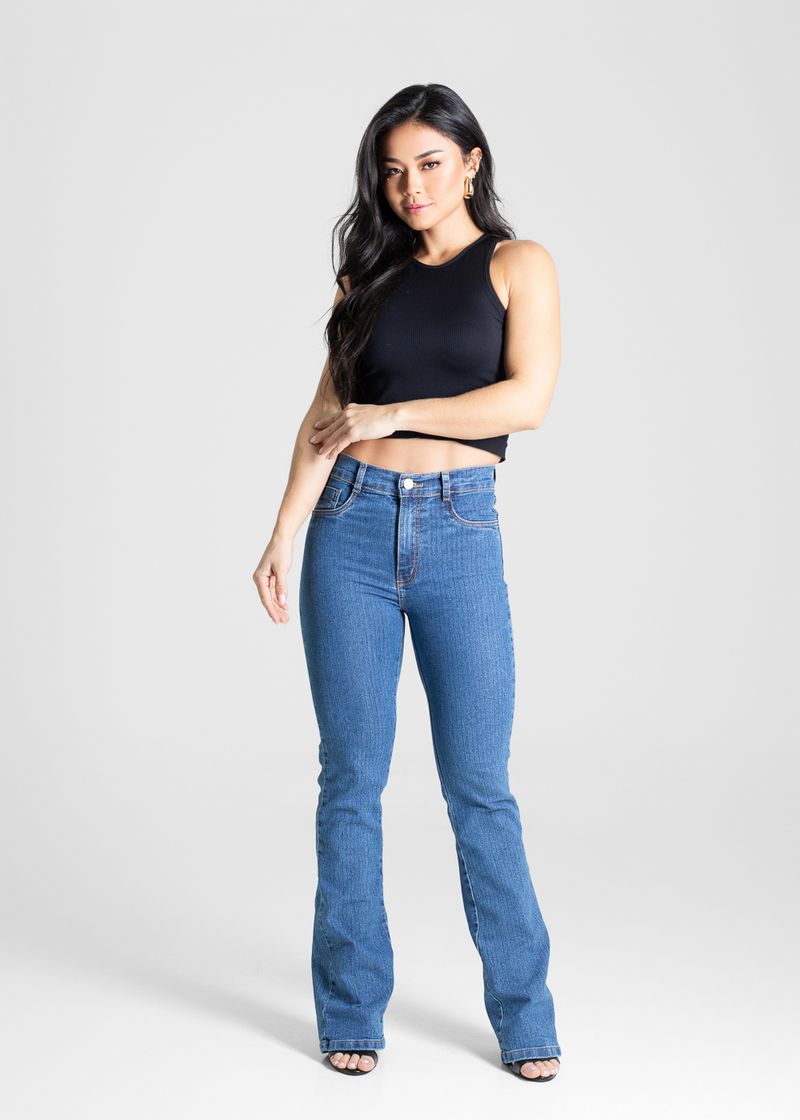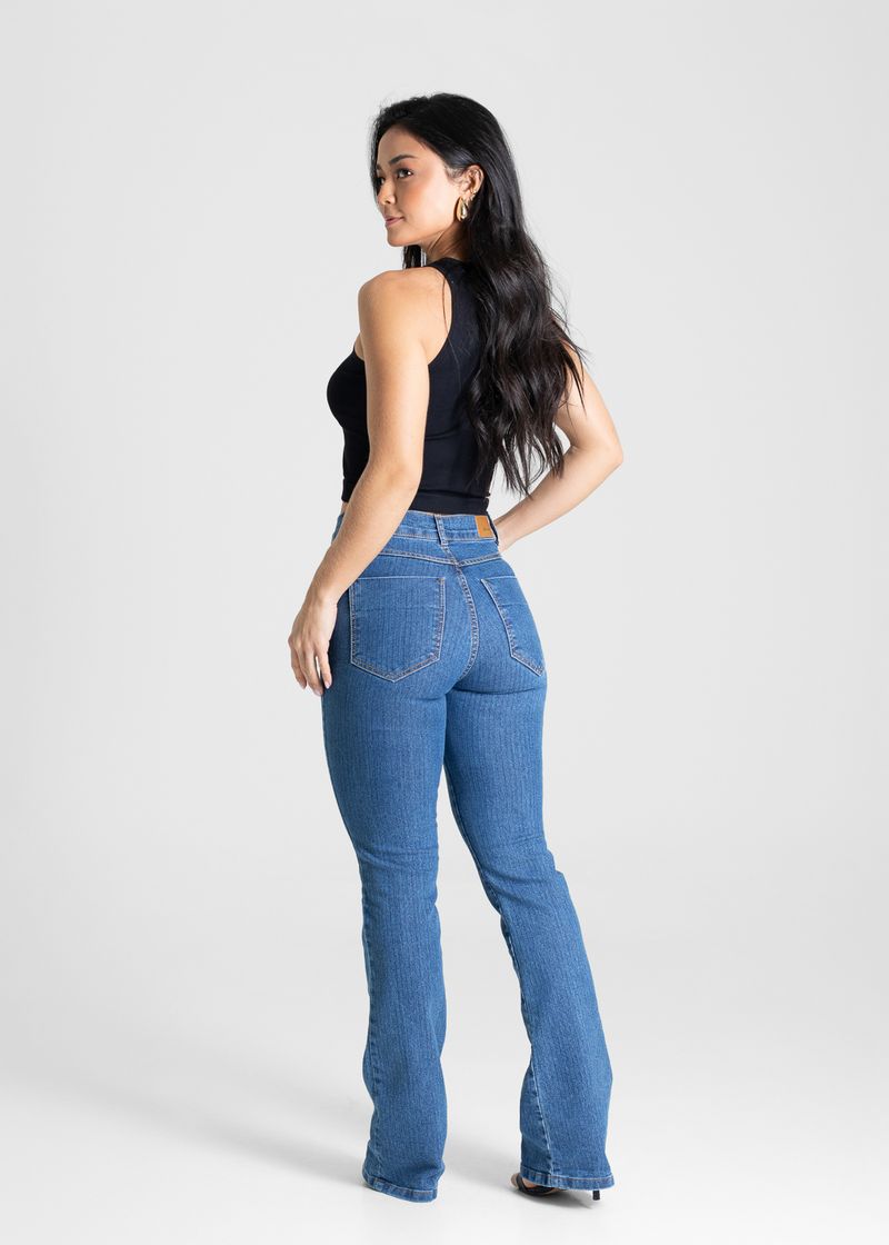 A modelagem boot cut tem o caimento ajustado nas pernas e levemente ampla barra. Cintura media Fechamento com botão e zíper Bolsos frontais falsos e posteriores funcionais Barra simples Modelagem: boot cut Tecido: Jeans Tipo de lavagem: Azul Cor: Azul medio