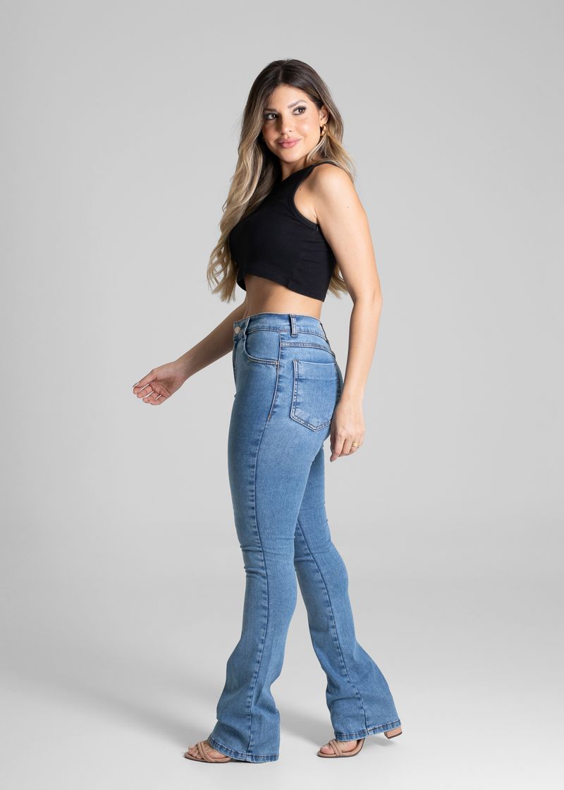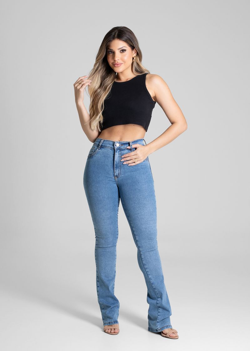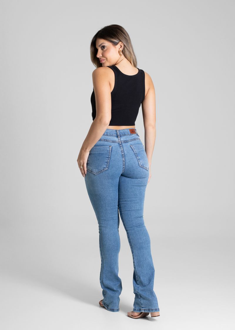 A modelagem boot cut tem o caimento ajustado nas pernas e levemente ampla barra. Cintura media Fechamento com botão e zíper Bolsos frontais falsos e posteriores funcionais Barra simples Modelagem: boot cut Tecido: Jeans Tipo de lavagem: Azul Cor: Azul médio