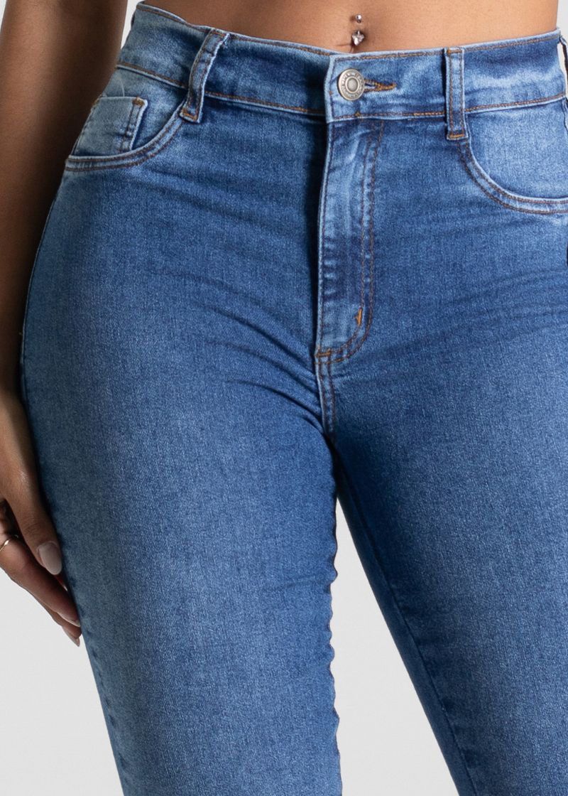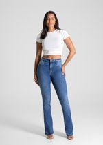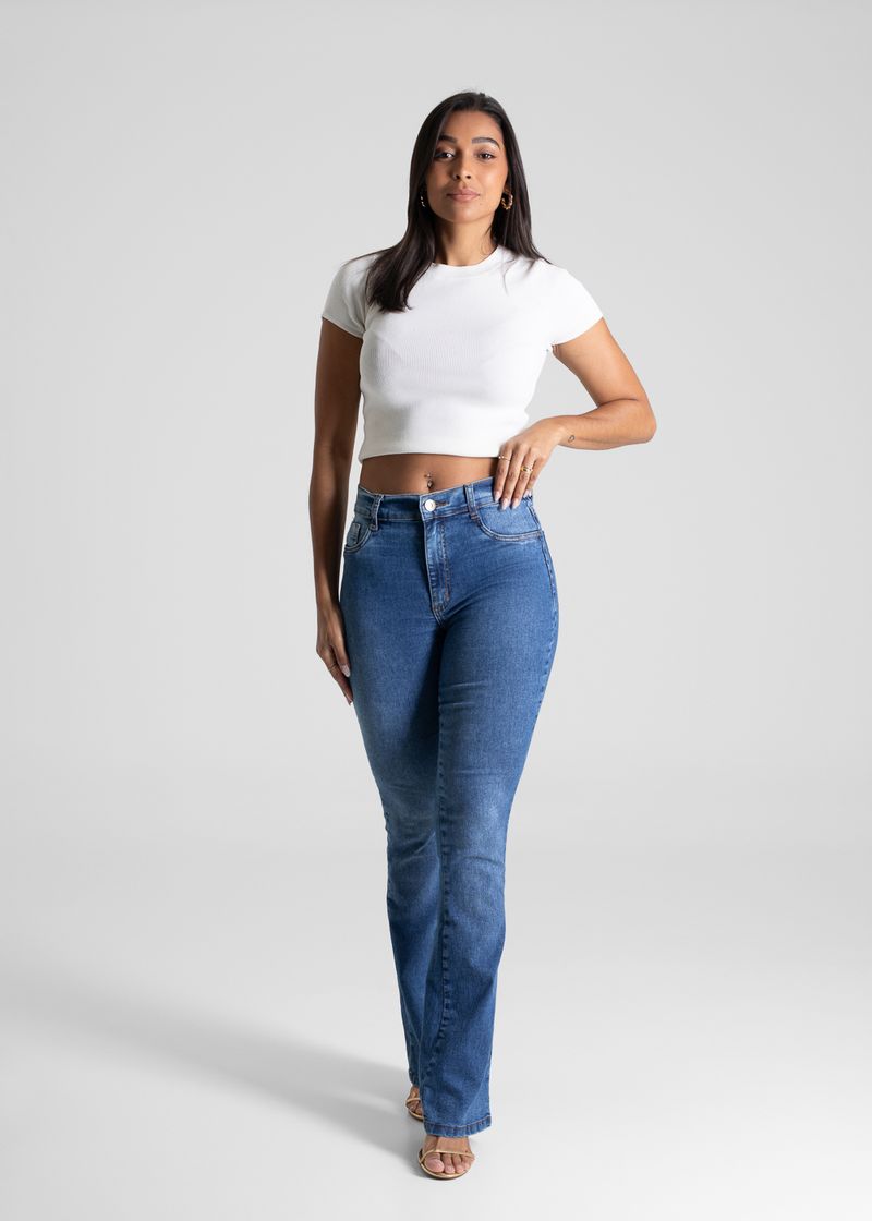 A modelagem boot cut tem o caimento ajustado nas pernas e levemente ampla barra. Cintura media Fechamento com botão e zíper Bolsos frontais falsos e posteriores funcionais Barra simples Modelagem: boot cut Tecido: Jeans Tipo de lavagem: Azul Cor: Azul medio