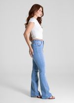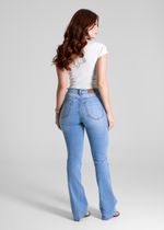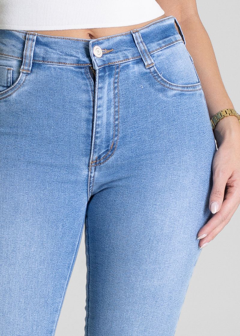 A modelagem boot cut tem o caimento ajustado nas pernas e levemente ampla barra. Cintura media Fechamento com botão e zíper Bolsos frontais falsos e posteriores funcionais Barra simples Modelagem: boot cut Tecido: Jeans Tipo de lavagem: Azul Cor: Azul claro