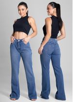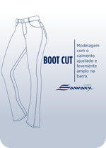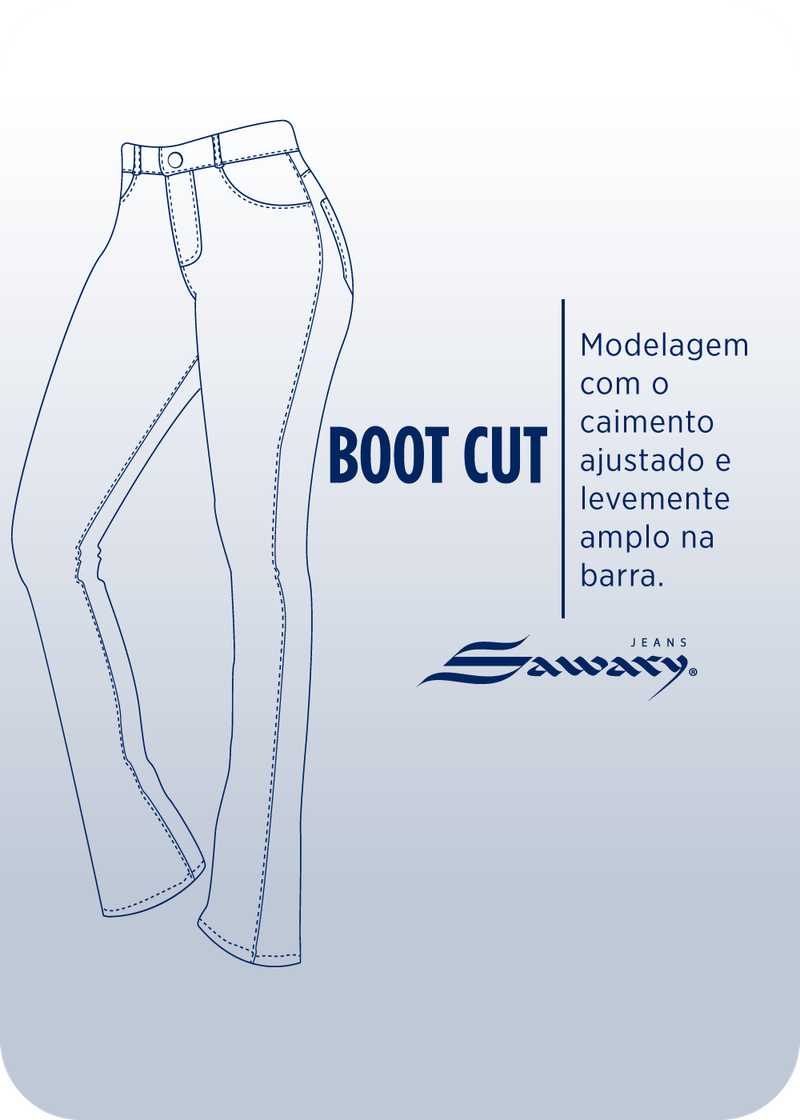 A modelagem boot cut tem o caimento ajustado nas pernas e levemente ampla barra. Cintura média Fechamento com botão e zíper Bolsos frontais e posteriores funcionais Barra com fenda Modelagem: boot cut Tecido: Jeans Tipo de lavagem: Azul Cor:Azul médio