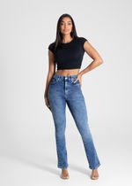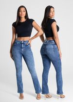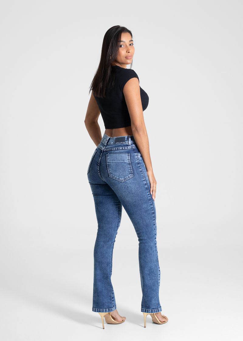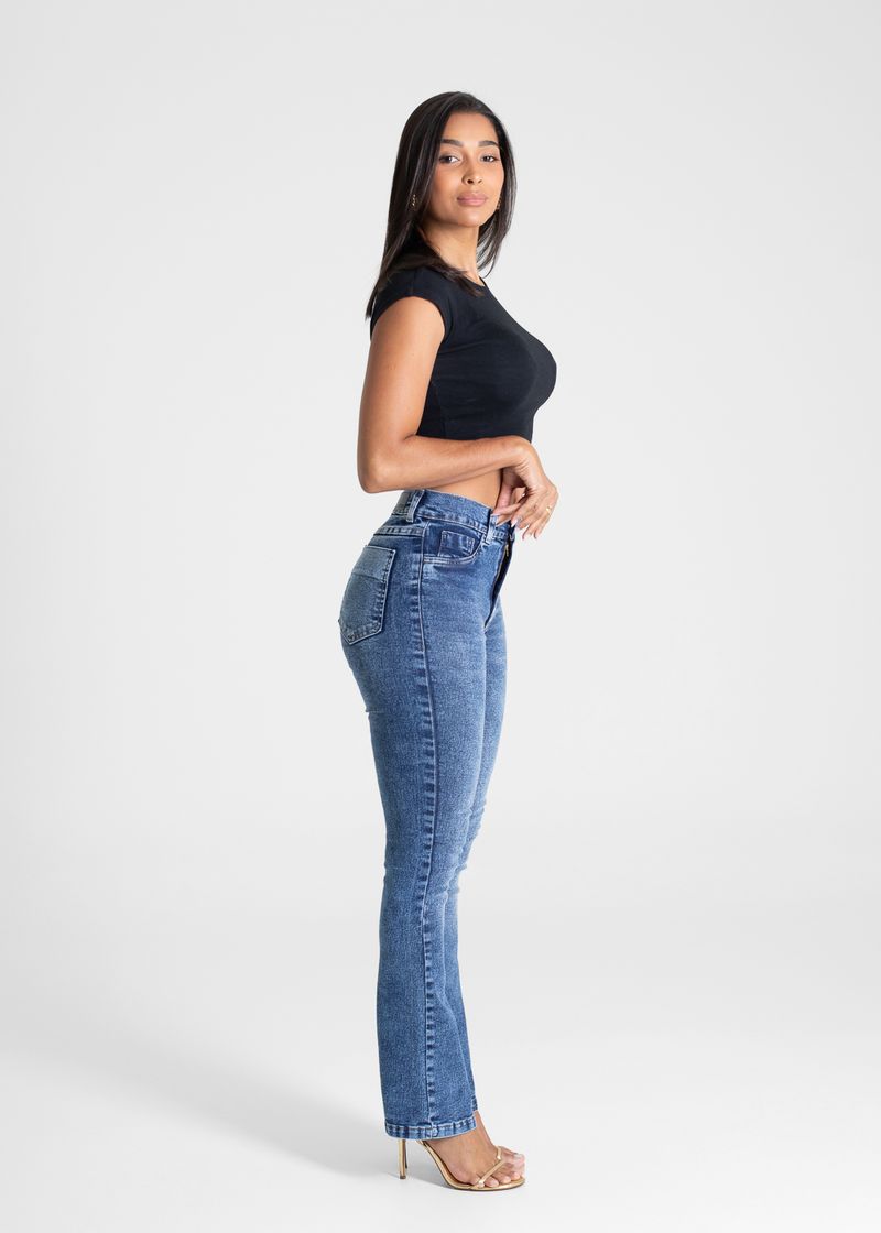 Calça feminina confeccionada em jeans. Modelo petit, especialmente desenvolvido para mulheres de até 1,65m de altura, com o comprimento ideal que dispensa ajustes ou barra. Cintura media Fechamento com botão e zíper Bolsos frontais falsos e posteriores funcionais Barra simples Modelagem: Boot cut petit Tecido: Jeans Tipo de lavagem: Azul Cor: Azul medio