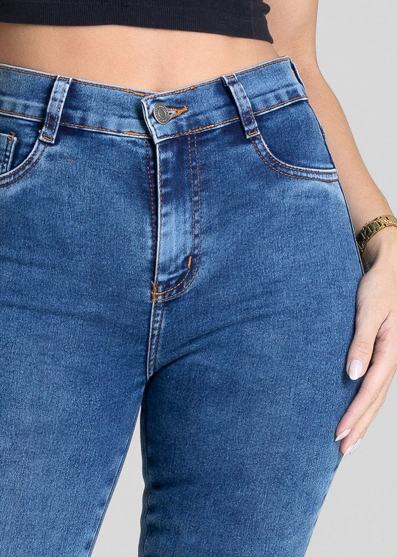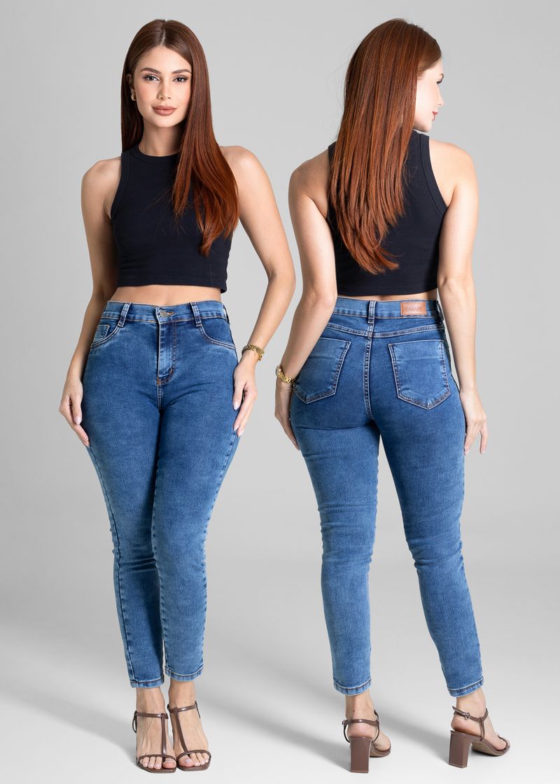 Calça cigarrete confeccionada em jeans. A modelagem é ajustada com o comprimento até o tornozelo. Cintura média Fechamento através de botão e zíper A barra tem acabamento simples Tecido: Jeans Tipo de Lavagem: Azul Cor: Azul