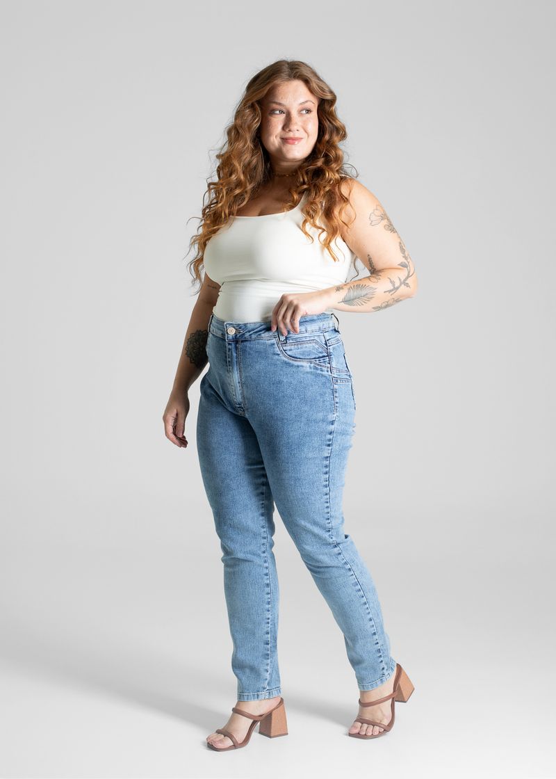 Calça plus size confeccionada em jeans. A modelagem cigarrete, sendo ajustado ao corpo até a altura do tornozelo. Cintura alta Fechamento com botão metálico e zíper Bolsos frontais falsos e bolsos traseiros funcionais Barra simples Modelagem: cigarrete Tecido: Jeans Tipo de lavagem: Azul Cor: Azul