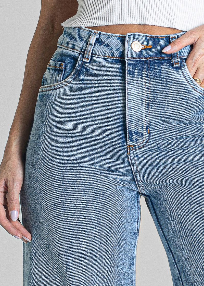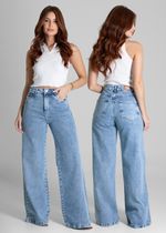 Calça feminina confeccionada em jeans. O modelo possui cintura super alta, gancho no lugar e caimento amplo da coxa até a barra, que é extra larga. Cintura alta Fechamento através de um botão e zíper Bolsos frontais e posteriores funcionais Barra simples Tecido: Jeans Tipo de Lavagem: Azul Cor: azul médio