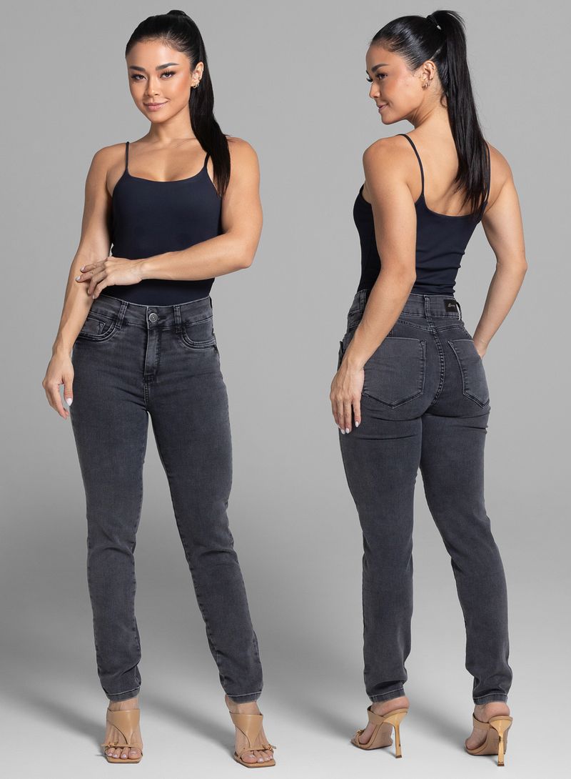 Calça levanta bumbum confeccionada em jeans. A modelagem tem quatro pences que valorizam as formas. Cintura médio Fechamento com botão metálico e zíper Bolsos frontais falsos e bolsos traseiros funcionais Barra simples Tecido: Jeans Tipo de lavagem: color Cor: preta