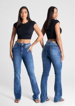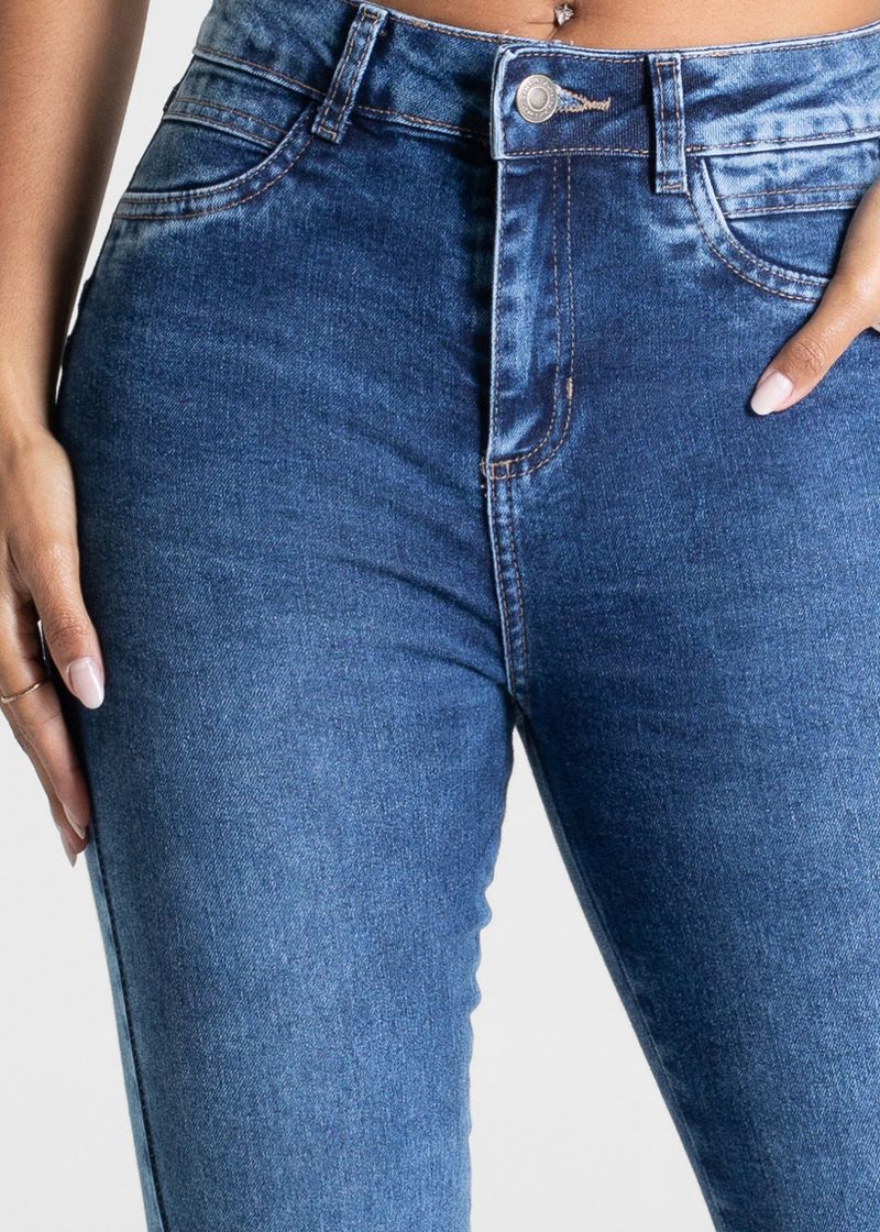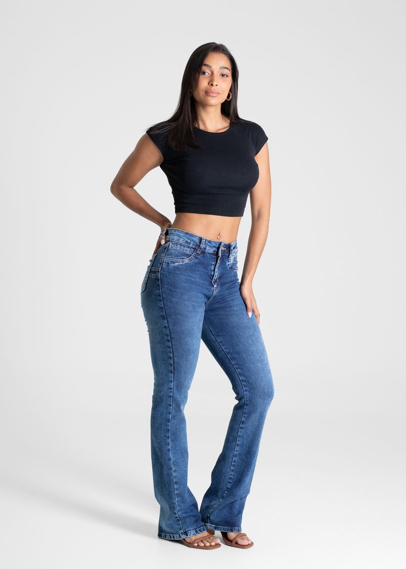 Calça levanta bumbum confeccionada em jeans. A modelagem tem quatro pences que valorizam as formas. Cintura médio Fechamento com botão metálico e zíper Bolsos frontais falsos e bolsos traseiros funcionais Barra simples Tecido: Jeans Tipo de lavagem: Azul Cor: Azul medio