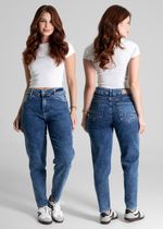 Calça mom confeccionada em jeans. A modelagem mom tem um caimento soltinho nos quadris e coxas ajustando até o tornozelo. Cintura alta Fechamento com botão e zíper Bolsos frontais e bolsos traseiros funcionais Barra simples Modelagem: Mom Tecido: Jeans Tipo de lavagem: Azul Cor: Azul