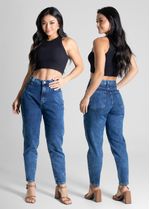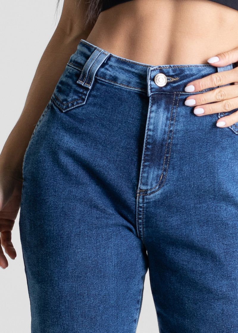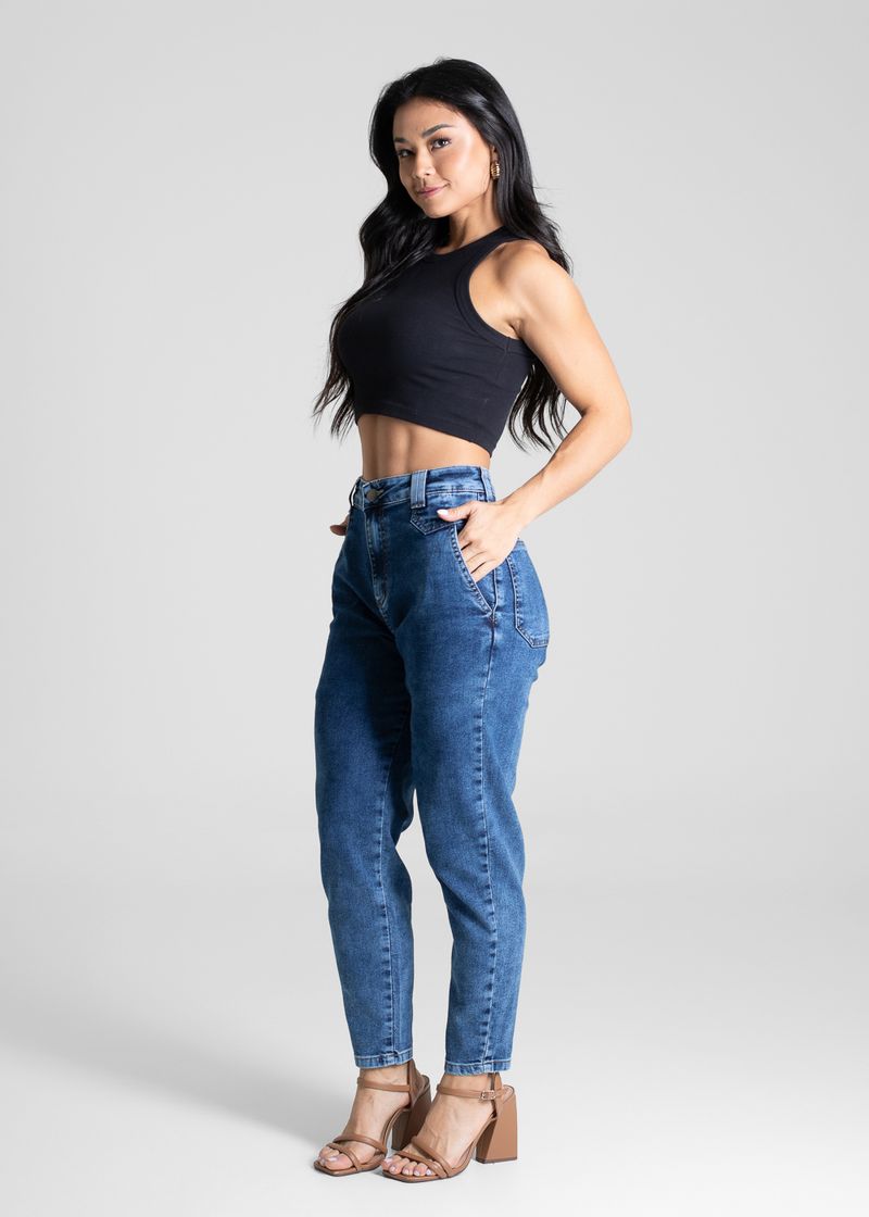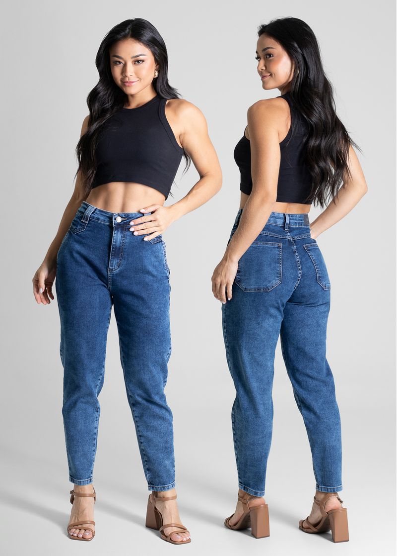 Calça mom confeccionada em jeans. A modelagem mom tem um caimento soltinho nos quadris e coxas ajustando até o tornozelo. Cintura alta Fechamento com botão e zíper Bolsos frontais e bolsos traseiros funcionais Barra simples Modelagem: Mom Tecido: Jeans Tipo de lavagem: Azul Cor: Azul