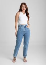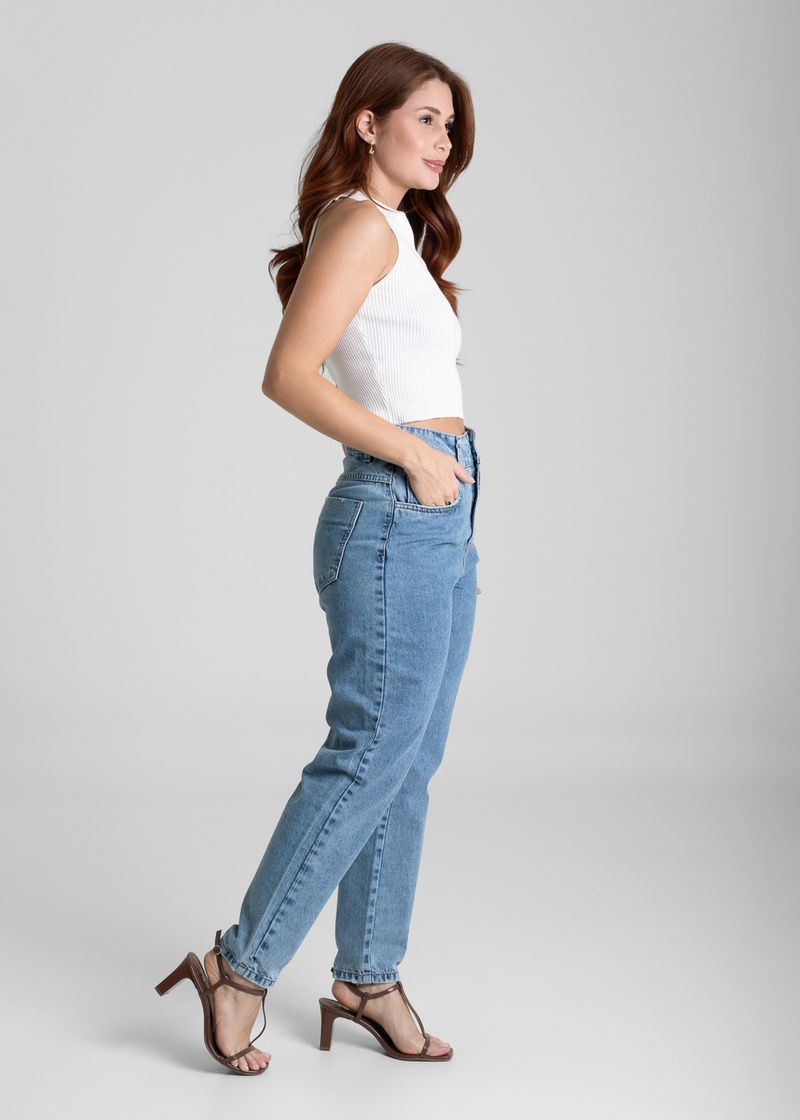 Calça mom confeccionada em jeans. A modelagem mom tem um caimento soltinho nos quadris e coxas ajustando até o tornozelo. Cintura alta Fechamento com botão e zíper Bolsos frontais e bolsos traseiros funcionais Barra simples Modelagem: Mom Tecido: Jeans Tipo de lavagem: Azul Cor: Azul