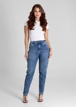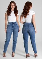 Calça mom confeccionada em jeans. A modelagem mom tem um caimento soltinho nos quadris e coxas ajustando até o tornozelo. Cintura alta Fechamento com botão e zíper Bolsos frontais e bolsos traseiros funcionais Barra simples Modelagem: Mom Tecido: Jeans Tipo de lavagem: Azul Cor: Azul