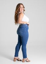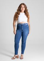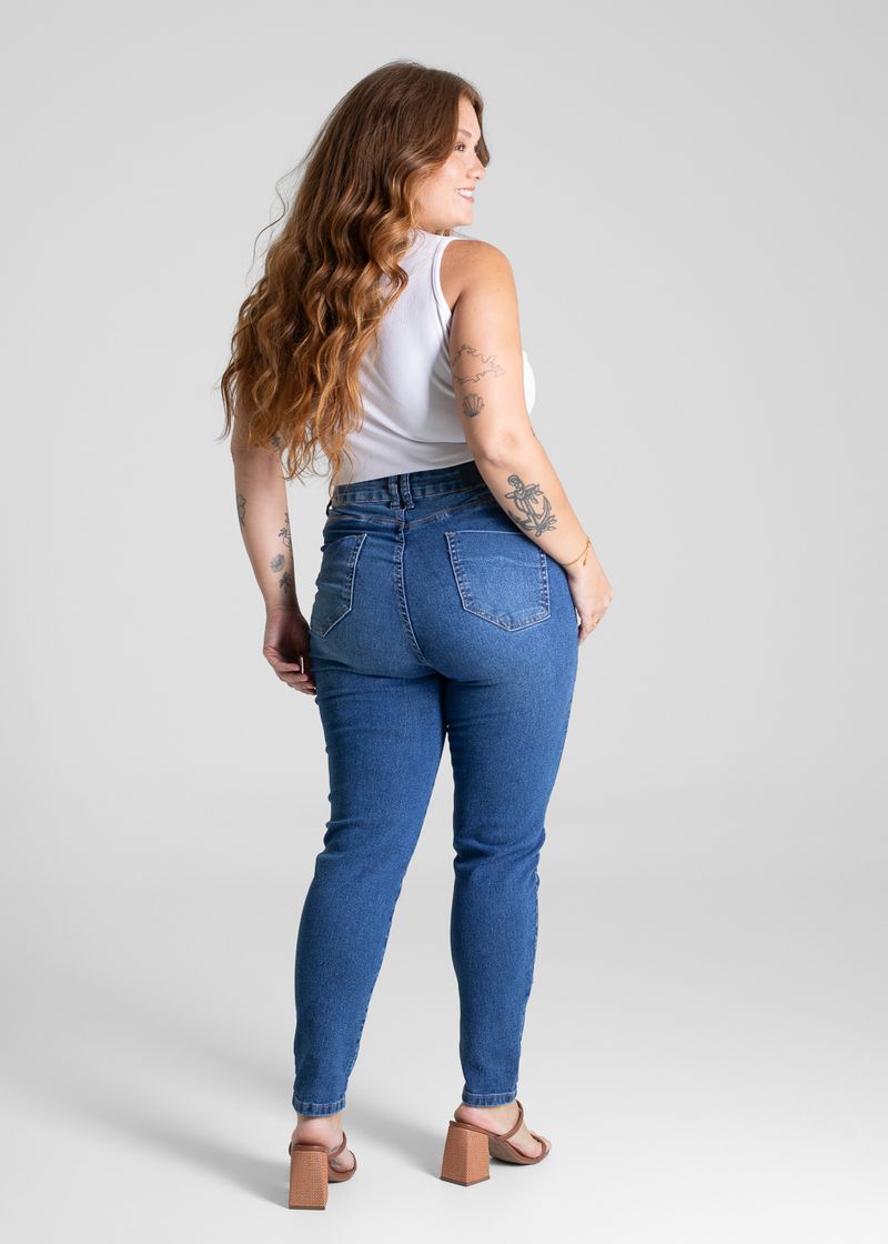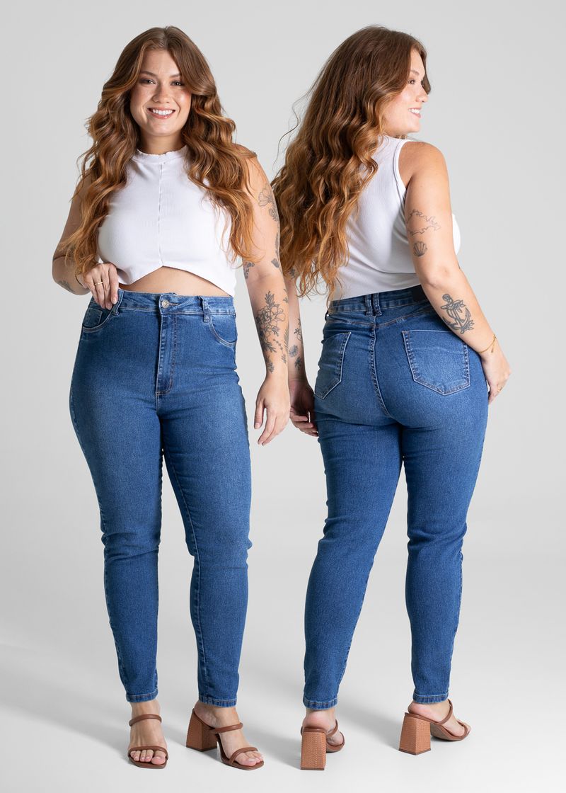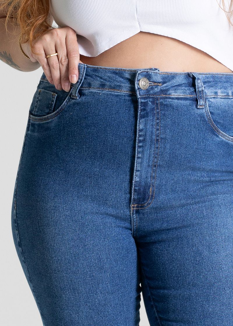 Calça plus size confeccionada em jeans. A modelagem tem tecnologia para dar um UP na silhueta Cintura alta Fechamento com botão metálico e zíper Bolsos frontais falsos e bolsos traseiros funcionais Barra simples Modelagem: Plus size Tecido: Jeans Tipo de lavagem: Azul Cor: Azul medio