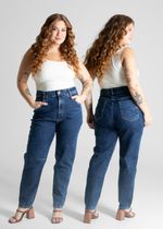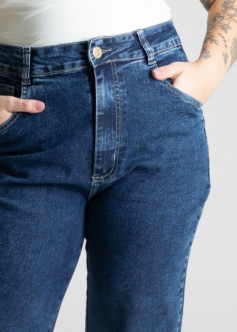 Calça mom plus size confeccionada em jeans. A modelagem mom tem um caimento soltinho nos quadris e coxas ajustando até o tornozelo. Cintura alta Fechamento com botão e zíper Bolsos frontais e bolsos traseiros funcionais Barra simples Modelagem: Plus size Tecido: Jeans Tipo de lavagem: Azul Cor: Azul