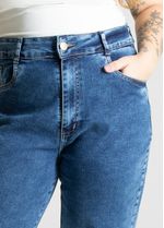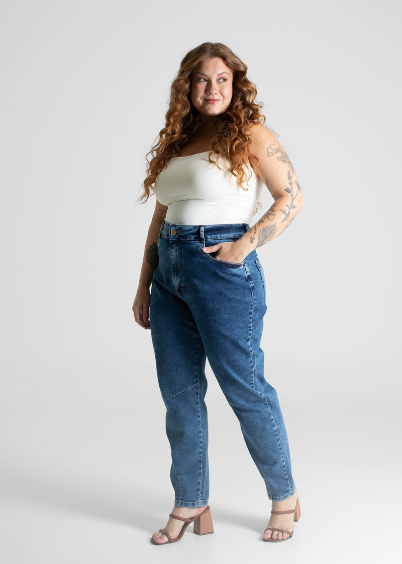 Calça mom plus size confeccionada em jeans. A modelagem mom tem um caimento soltinho nos quadris e coxas ajustando até o tornozelo. Cintura alta Fechamento com botão e zíper Bolsos frontais e bolsos traseiros funcionais Barra simples Modelagem: Plus size Tecido: Jeans Tipo de lavagem: Azul Cor: Azul