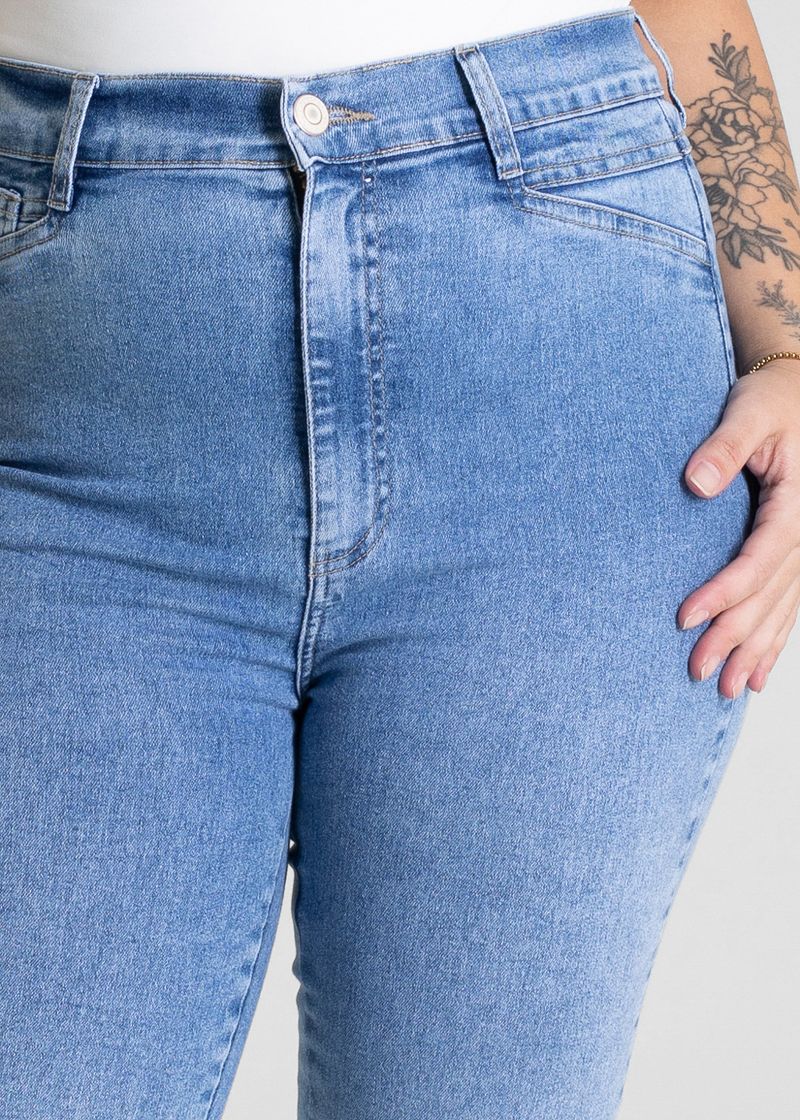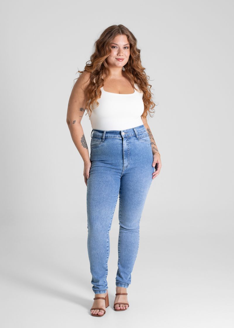 Calça plus size confeccionada em jeans. A modelagem é skinny com caimento super ajustado ao corpo. Cintura média Fechamento com botão e zíper Bolsos frontais falsos e bolsos traseiros funcionais Barra simples Modelagem: plus size Tecido: Jeans Tipo de lavagem: Azul Cor: Azul claro