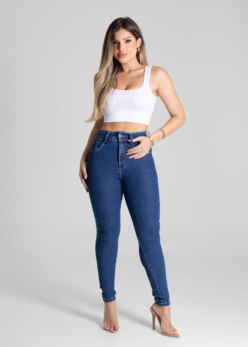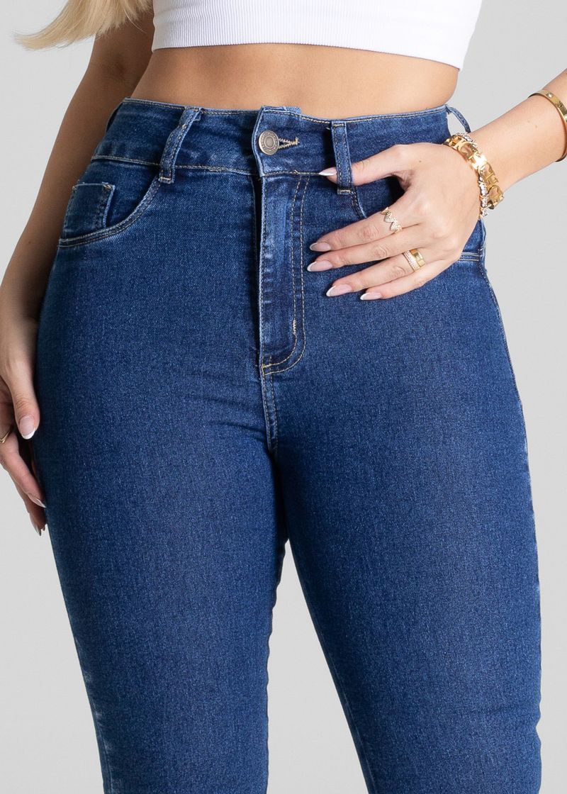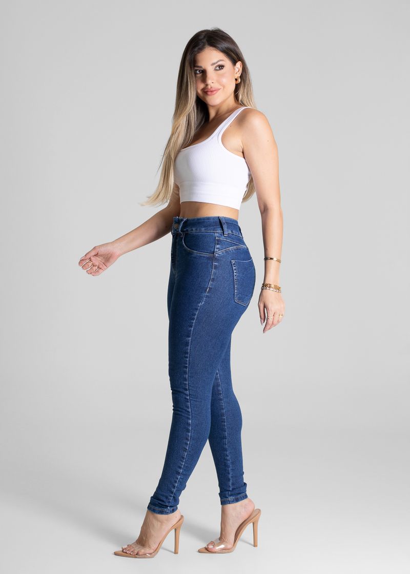 Calça push up confeccionada em jeans. A modelagem tem tecnologia para dar um UP na silhueta. Cintura média Fechamento com botão metálico e zíper Bolsos frontais falsos e bolsos traseiros funcionais Barra cortada Modelagem: Push up Tecido: Jeans Tipo de lavagem: Azul Cor: Azul médio