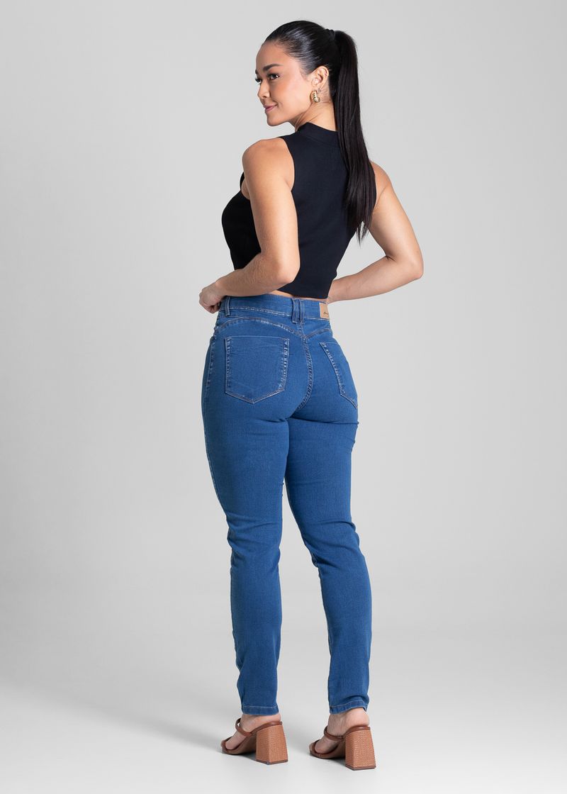 Calça push up confeccionada em jeans. A modelagem tem tecnologia para dar um UP na silhueta. Cintura média Fechamento com botão metálico e zíper Bolsos frontais falsos e bolsos traseiros funcionais Barra cortada Modelagem: Push up Tecido: Jeans Tipo de lavagem: Azul Cor: Azul médio
