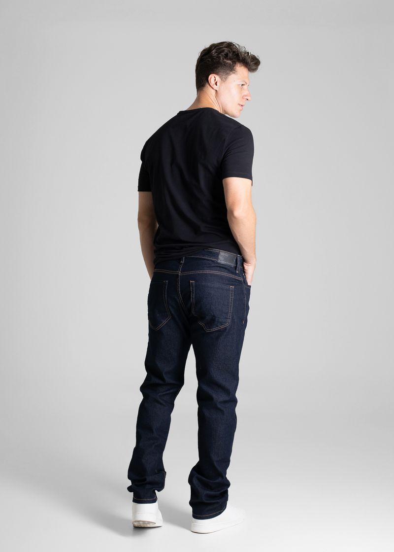 Calça reta confeccionada em jeans. Modelagem tem o caimento reto. Cintura média Fechamento com botão metálico e zíper Bolsos frontais e bolsos protetores Barra simples Modelagem: Reta Tecido: Jeans Tipo de lavagem: Azul Cor: Azul médio