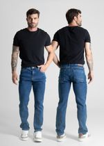 Calça confeccionada em jeans. Modelagem tem o caimento reto. Cintura média Fechamento com botão metálico e zíper Bolsos frontais e bolsos protetores Barra simples Modelagem: Reta Tecido: Jeans Tipo de lavagem: Azul Cor: Azul médio
