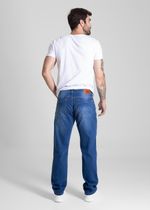 Calça confeccionada em jeans. Modelagem tem o caimento reto. Cintura média Fechamento com botão metálico e zíper Bolsos frontais e bolsos protetores Barra simples Modelagem: Reta Tecido: Jeans Tipo de lavagem: Azul Cor: Azul médio