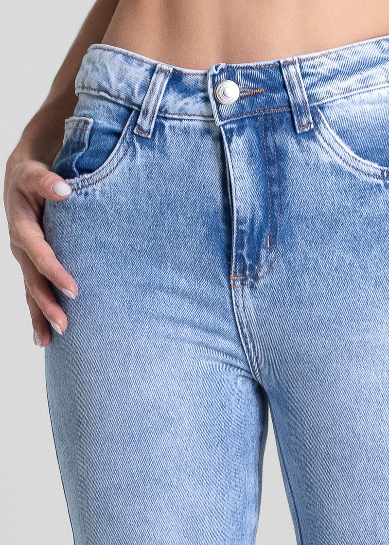 Calça jeans feminina de modelagem reta, com caimento mais solto ao corpo. Cintura média Fechamento com botão e zíper Bolsos frontais e bolsos traseiros funcionais Barra simples Tecido: Jeans Tipo de lavagem: Azul Cor: Azul claro