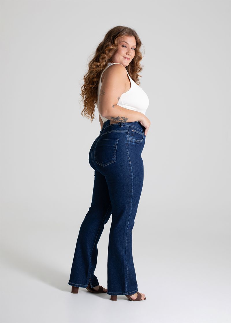 Calça plus size confeccionada em jeans .modelagem reta, com caimento mais solto ao corpo. Cintura média Fechamento com botão e zíper Bolsos frontais falsos e bolsos traseiros funcionais Barra com fenda lateral Tecido: Jeans Tipo de lavagem: Azul Cor: Azul