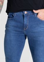 Calça slim confeccionada em jeans. Modelagem ajustada até a barra. Cintura média Fechamento com botão metálico e zíper Bolsos frontais e bolsos protetores Barra simples Modelagem: Men slim Tecido: Jeans Tipo de lavagem: Azul Cor: Azul médio