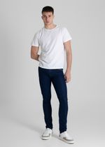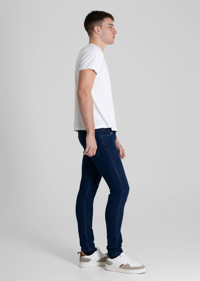 Calça slim confeccionada em jeans. Modelagem ajustada até a barra. Cintura média Fechamento com botão metálico e zíper Bolsos frontais e bolsos protetores Barra simples Modelagem: Men slim Tecido: Jeans Tipo de lavagem: Azul Cor: Azul médio