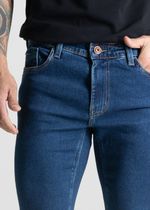 Calça slim confeccionada em jeans. Modelagem ajustada até a barra. Cintura média Fechamento com botão metálico e zíper Bolsos frontais e bolsos protetores Barra simples Modelagem: Men slim Tecido: Jeans Tipo de lavagem: Azul Cor: Azul médio