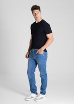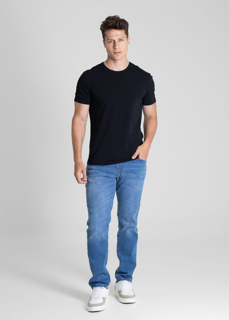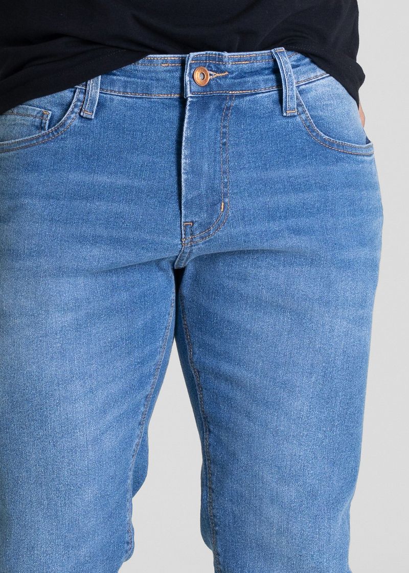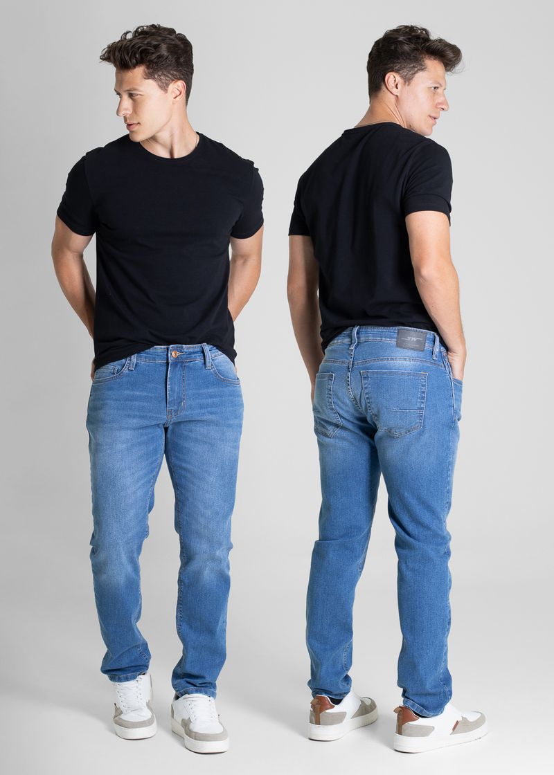 Calça slim confeccionada em jeans. Modelagem ajustada até a barra. Cintura média Fechamento com botão metálico e zíper Bolsos frontais e bolsos protetores Barra simples Modelagem: Men slim Tecido: Jeans Tipo de lavagem: Azul Cor: Azul médio