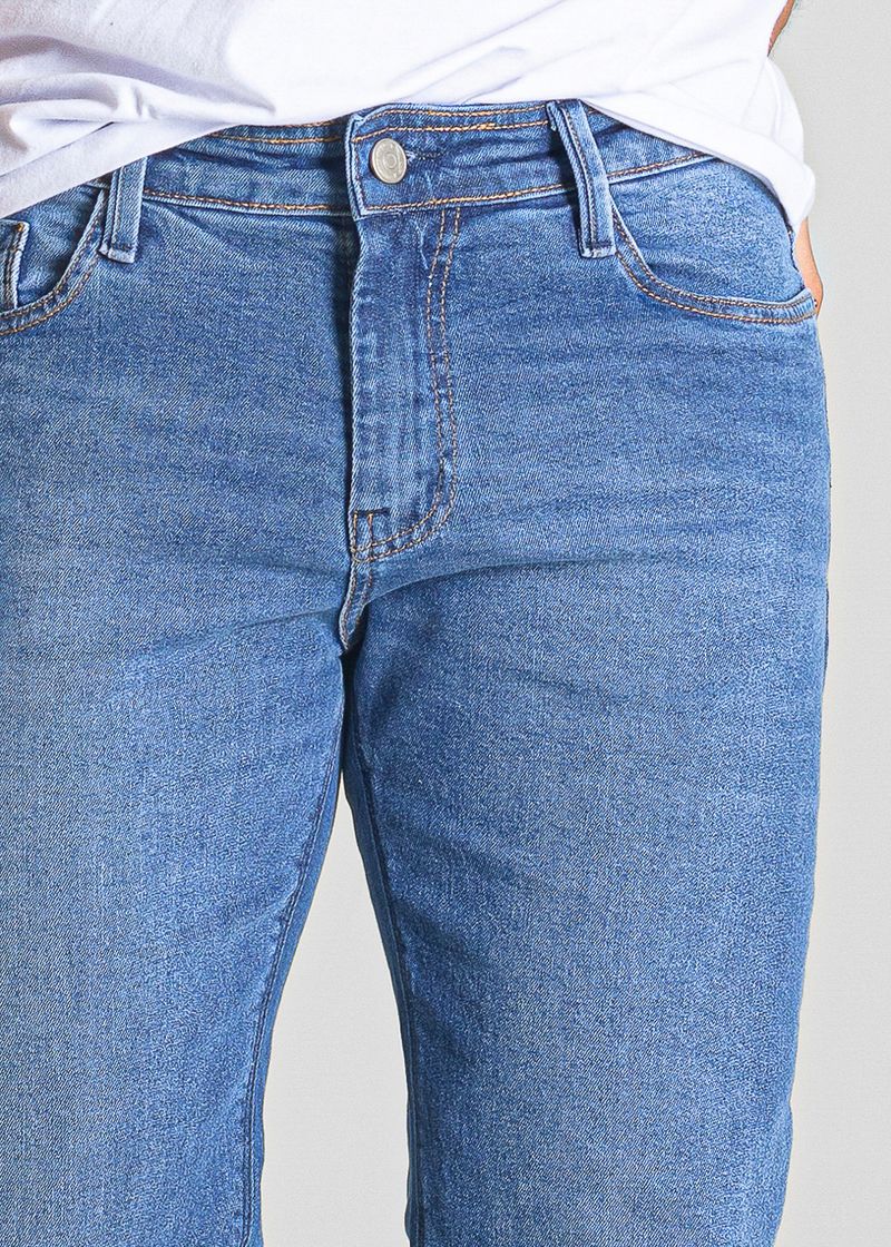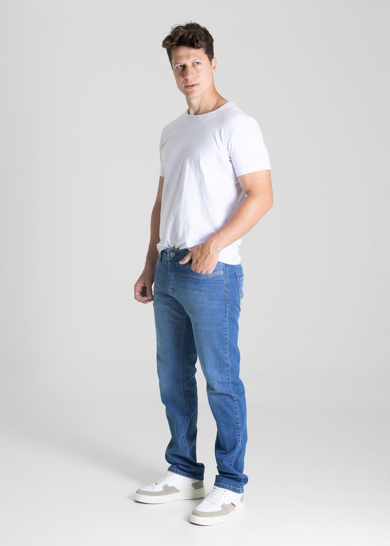 Calça slim confeccionada em jeans. Modelagem ajustada até a barra. Cintura média Fechamento com botão metálico e zíper Bolsos frontais e bolsos protetores Barra simples Modelagem: Men slim Tecido: Jeans Tipo de lavagem: Azul Cor: Azul médio