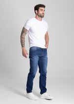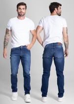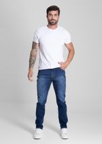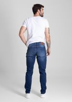 Calça slim confeccionada em jeans. Modelagem ajustada até a barra. Cintura média Fechamento com botão metálico e zíper Bolsos frontais e bolsos protetores Barra simples Modelagem: Men slim Tecido: Jeans Tipo de lavagem: Color Cor: Azul médio
