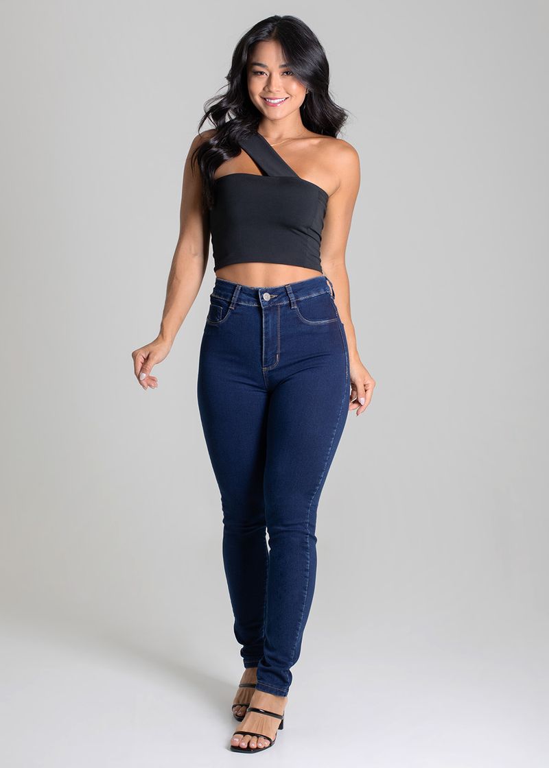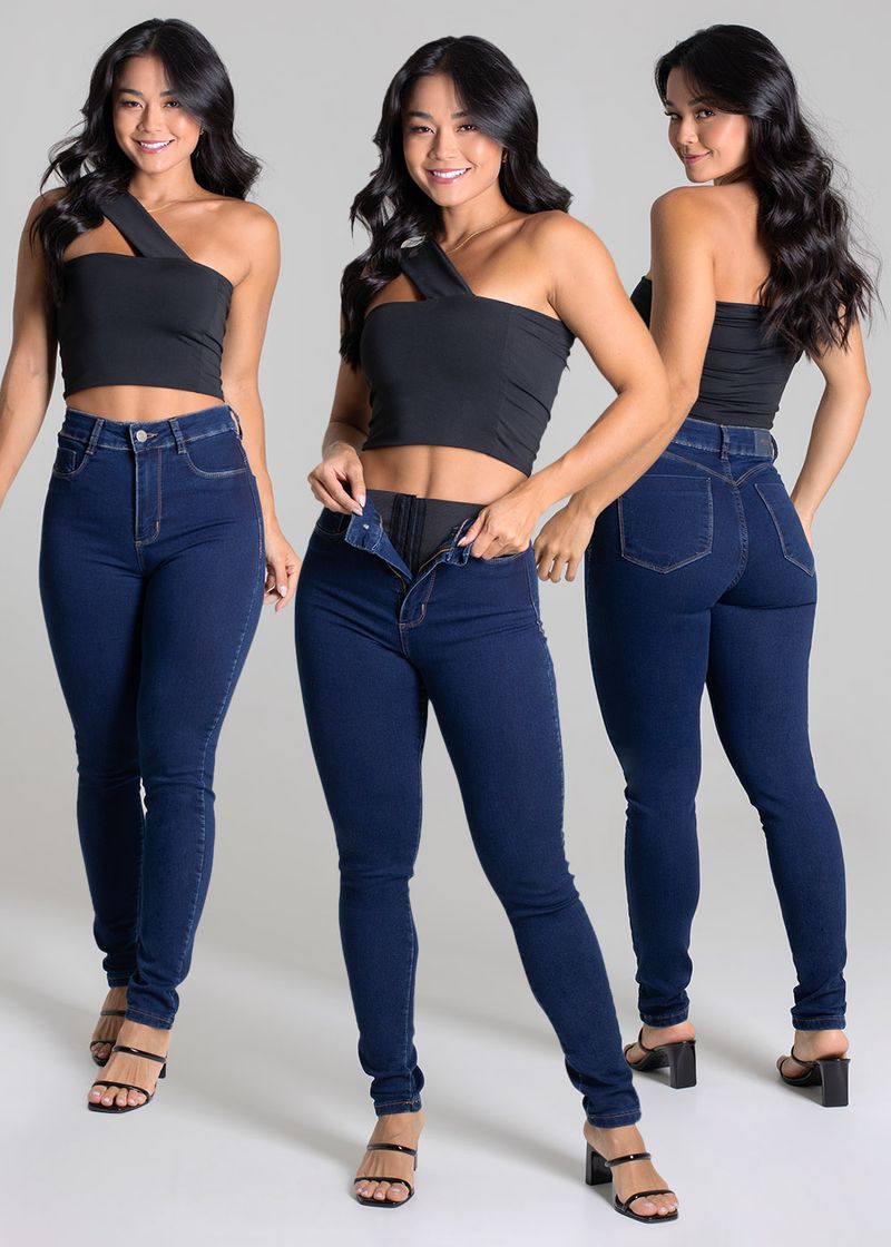Calça super lipo confeccionada em jeans. A modelagem possui uma cinta proporcionando ajuste perfeito para o seu corpo Cintura alta Fechamento com botão e zíper Bolsos frontais falsos e bolsos traseiros funcionais Barra acabamento simples Modelagem: Super lipo Tecido: Jeans Tipo de lavagem: Azul Cor: Azul