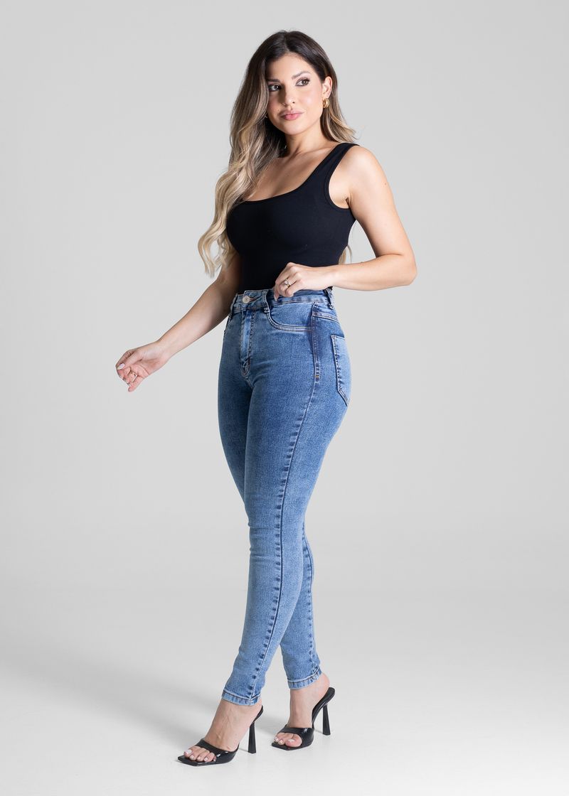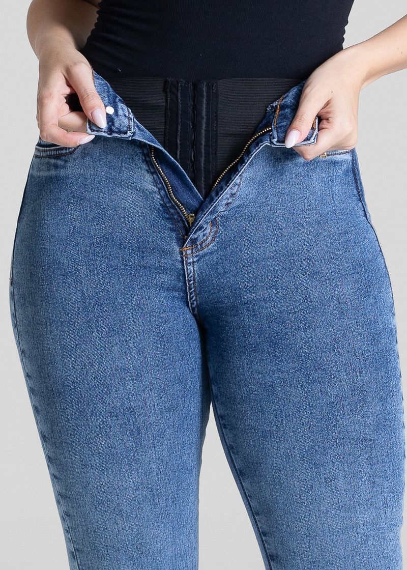 Calça super lipo confeccionada em jeans. A modelagem possui uma cinta proporcionando ajuste perfeito para o seu corpo Cintura alta Fechamento com botão e zíper Bolsos frontais falsos e bolsos traseiros funcionais Barra acabamento simples Modelagem: Super lipo Tecido: Jeans Tipo de lavagem: Azul médio Cor: Azul medio