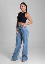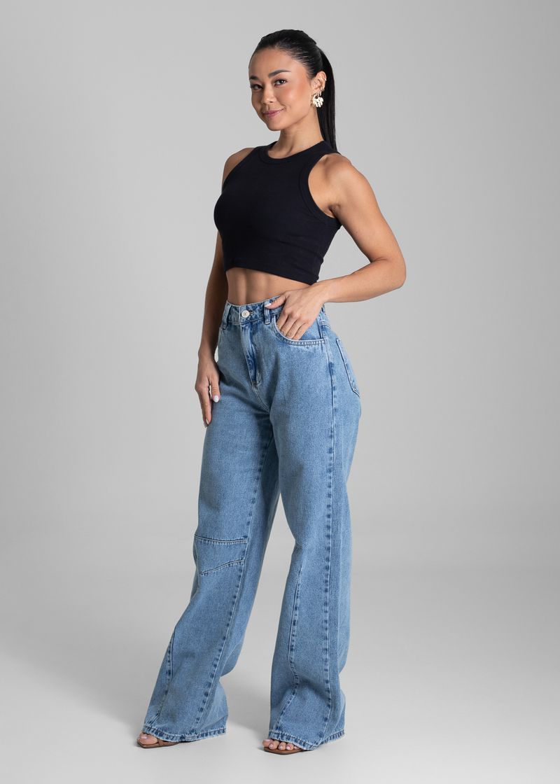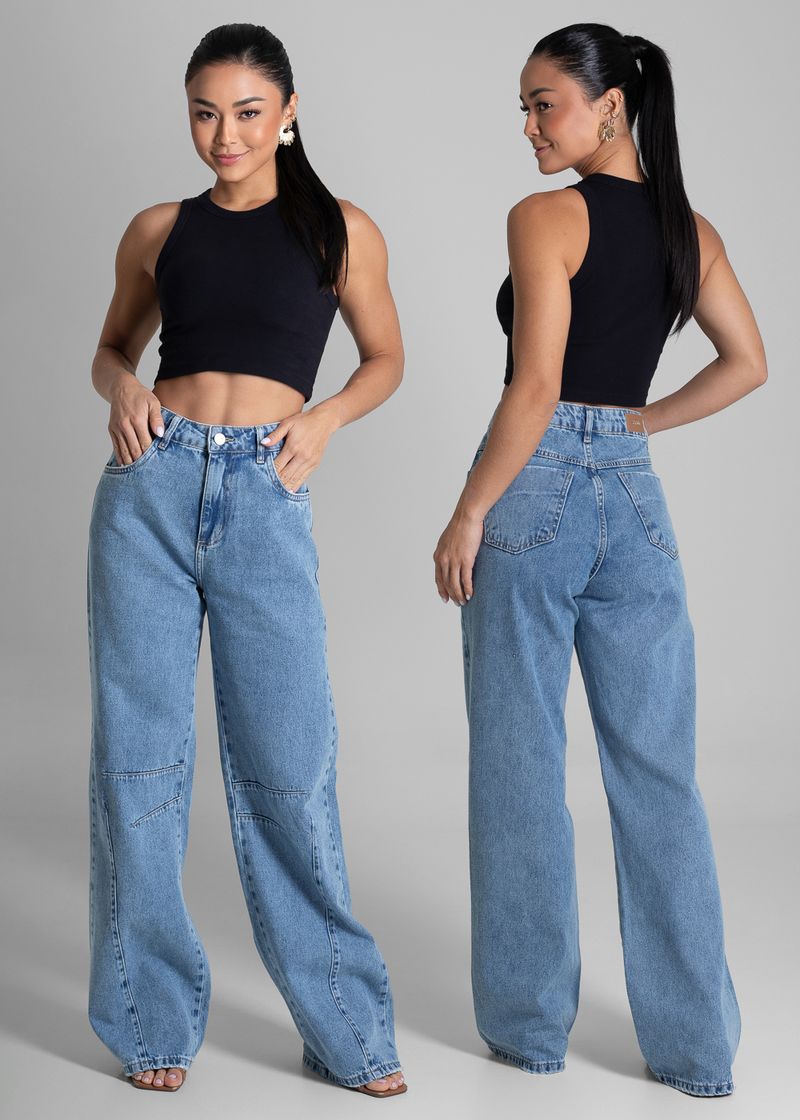 Calça feminina confeccionada em jeans. O modelo possui cintura super alta, gancho no lugar e caimento amplo da coxa até a barra. Cintura alta Fechamento através de um botão e zíper Bolsos frontais e posteriores funcionais Barra desfiada Tecido: Jeans Tipo de Lavagem: Azul Cor: Azul