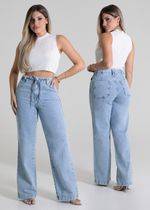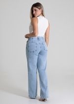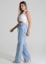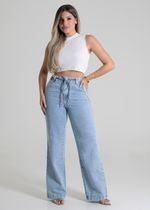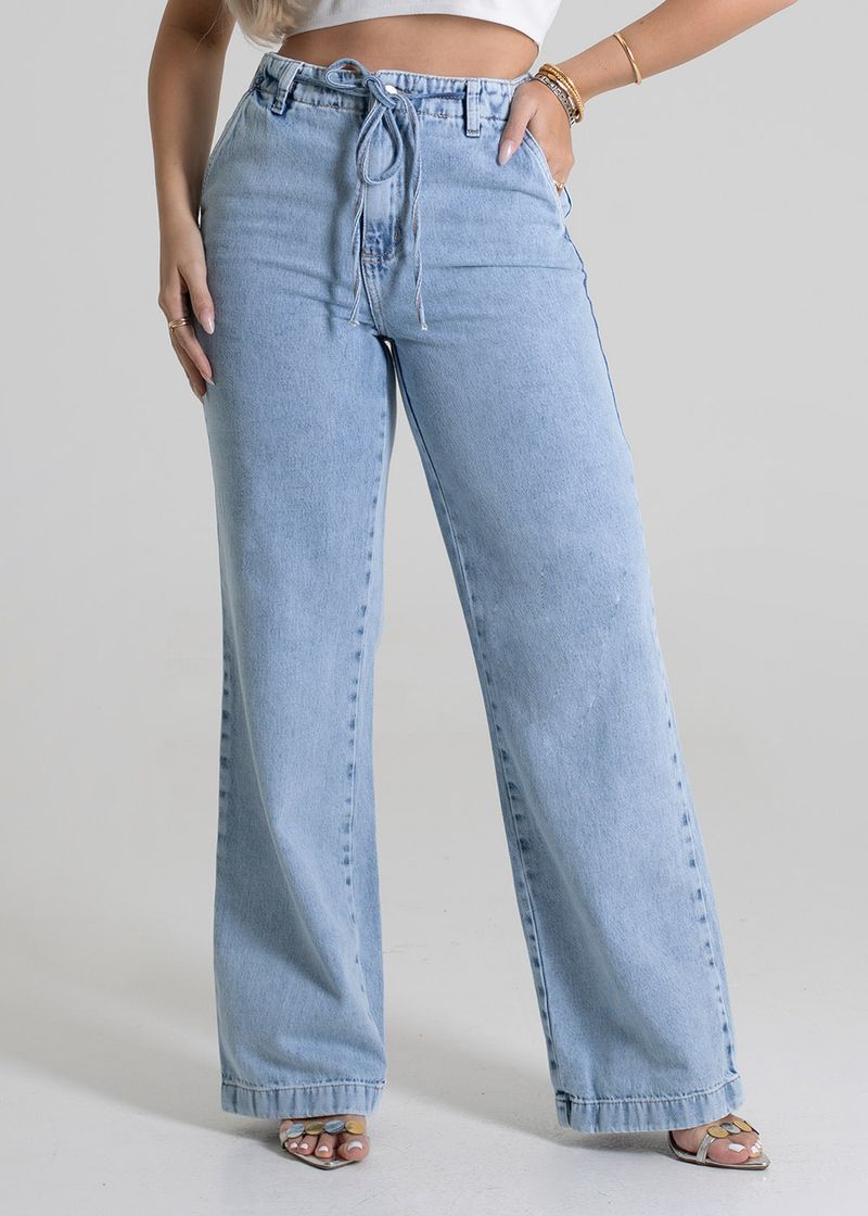 Calça feminina confeccionada em jeans. O modelo possui cintura super alta, gancho no lugar e caimento amplo da coxa até a barra. Cintura alta Fechamento através de um botão e zíper.cós acompanha um cordão com o mesmo tecido para amarração Bolsos frontais e posteriores funcionais Barra simples Tecido: Jeans Tipo de Lavagem: azul Cor: Azul claro