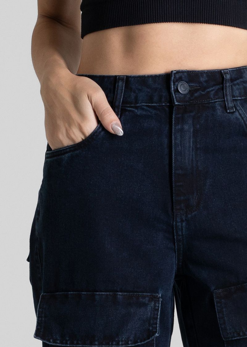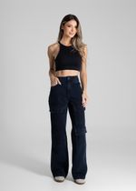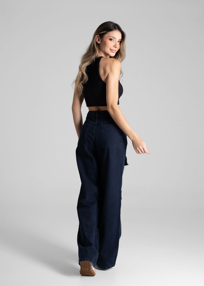 Calça feminina confeccionada em jeans. O modelo possui cintura super alta, gancho no lugar e caimento amplo da coxa até a barra. Cintura alta Fechamento através de um botão e zíper Bolsos frontais e posteriores funcionais Barra simples Tecido: Jeans Tipo de Lavagem: Color Cor: azul escuro