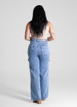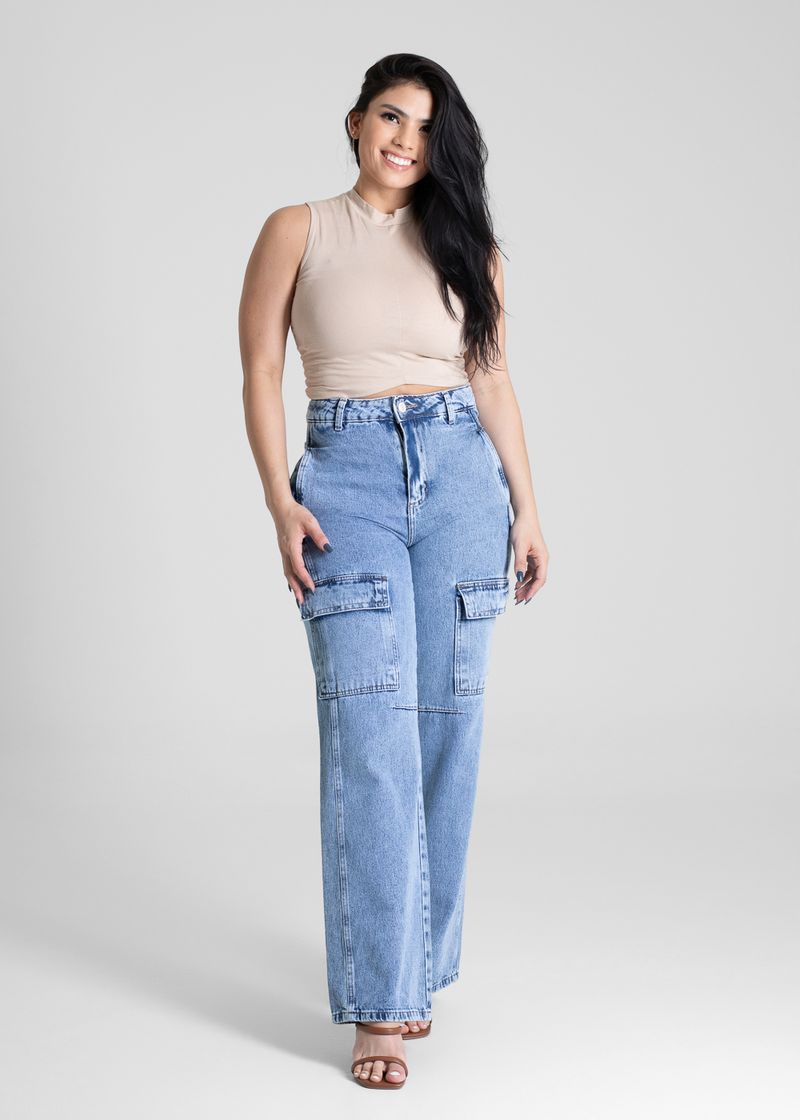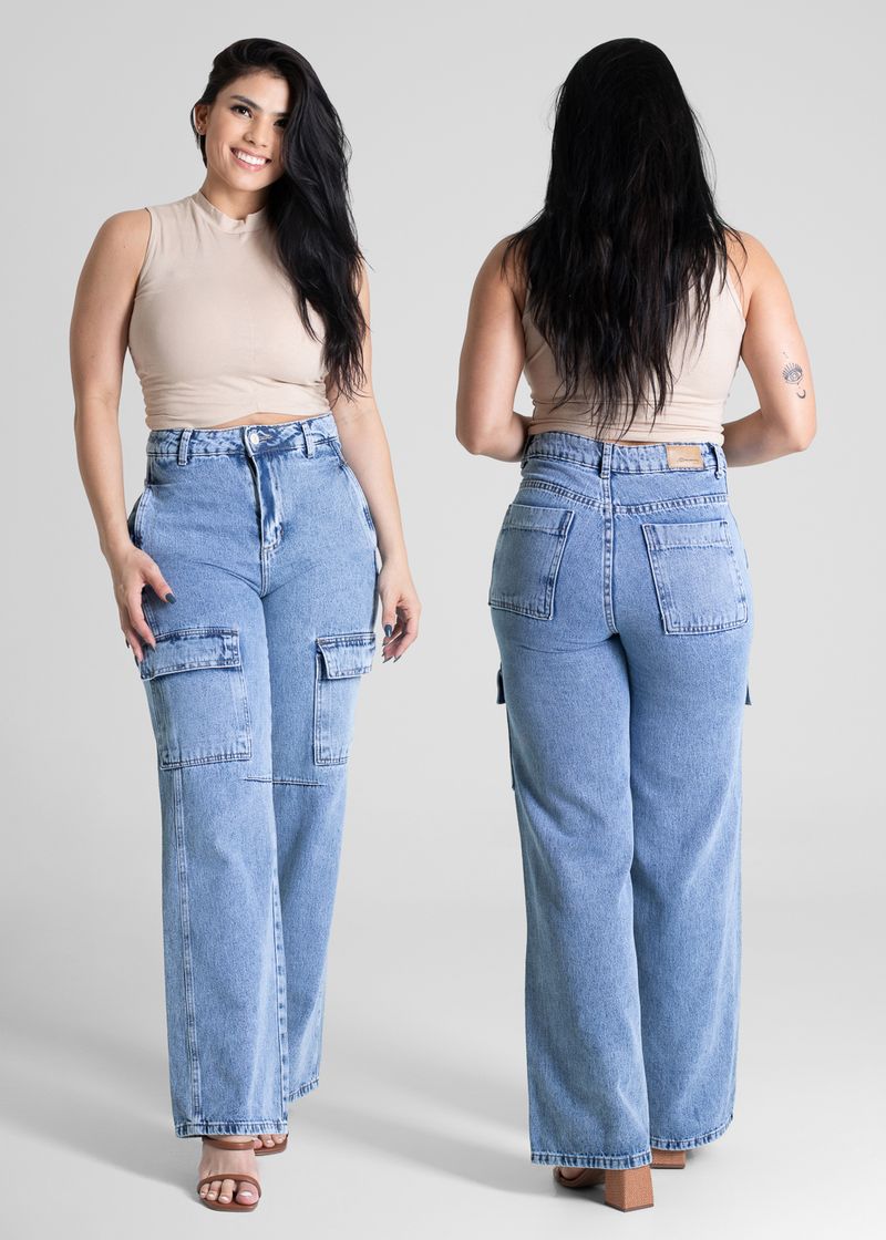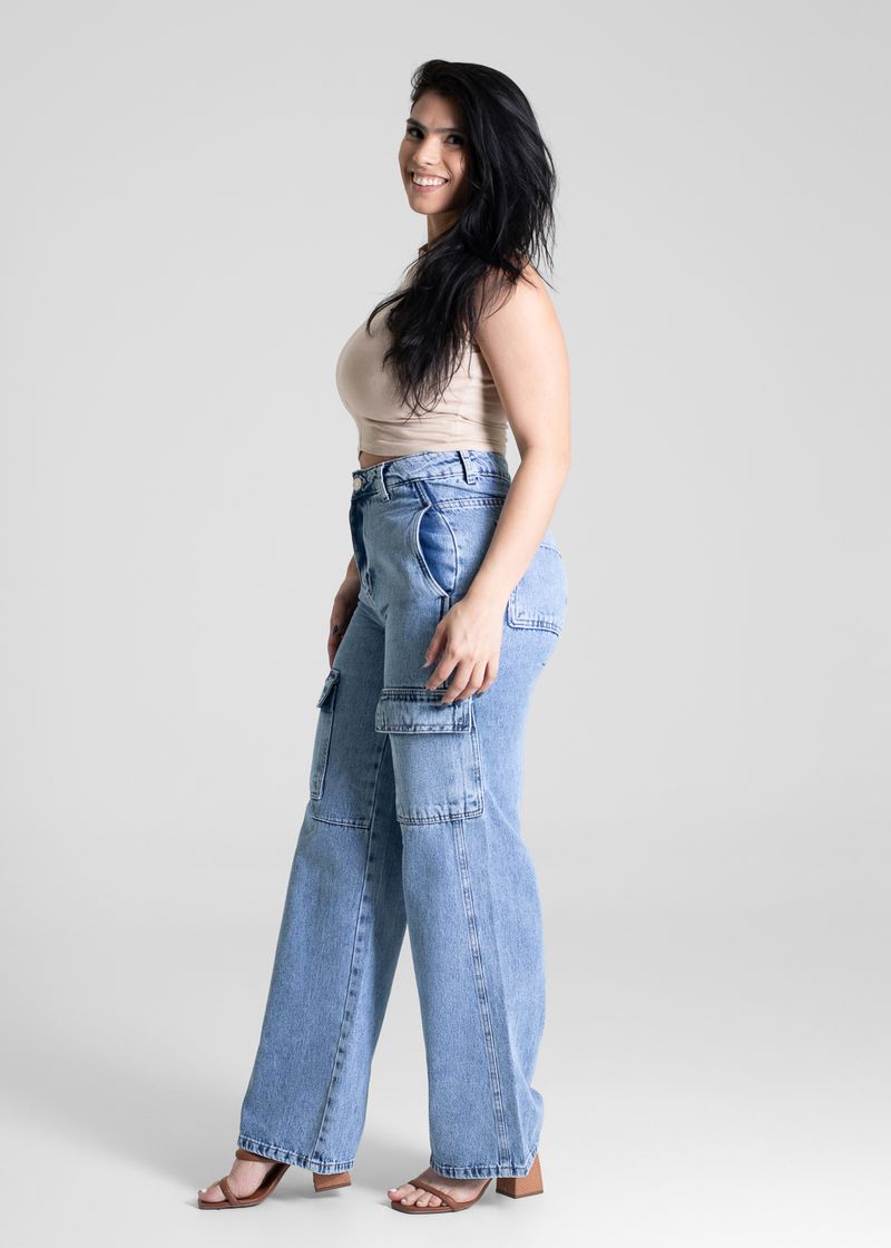 Calça feminina confeccionada em jeans. O modelo possui cintura super alta, gancho no lugar e caimento amplo da coxa até a barra. Cintura alta Fechamento através de um botão e zíper Bolsos frontais e posteriores funcionais bolsos cargo Barra simples Tecido: Jeans Tipo de Lavagem: Azul Cor: Azul
