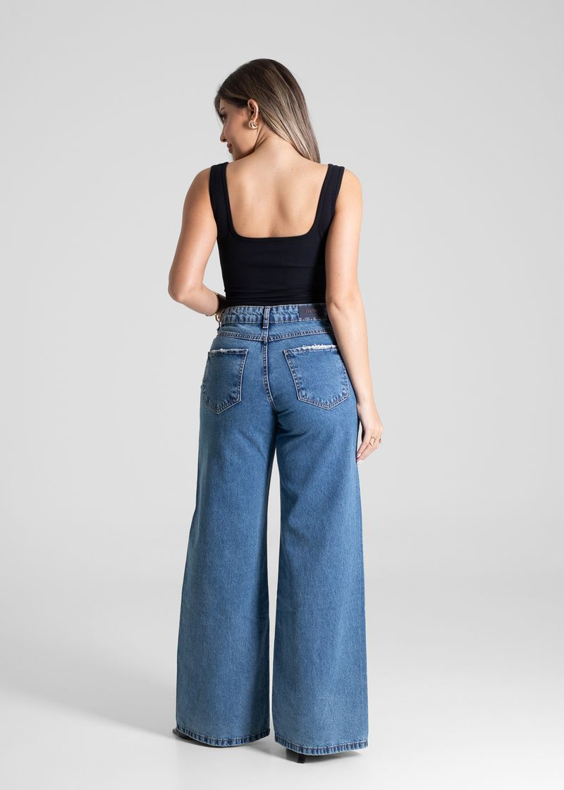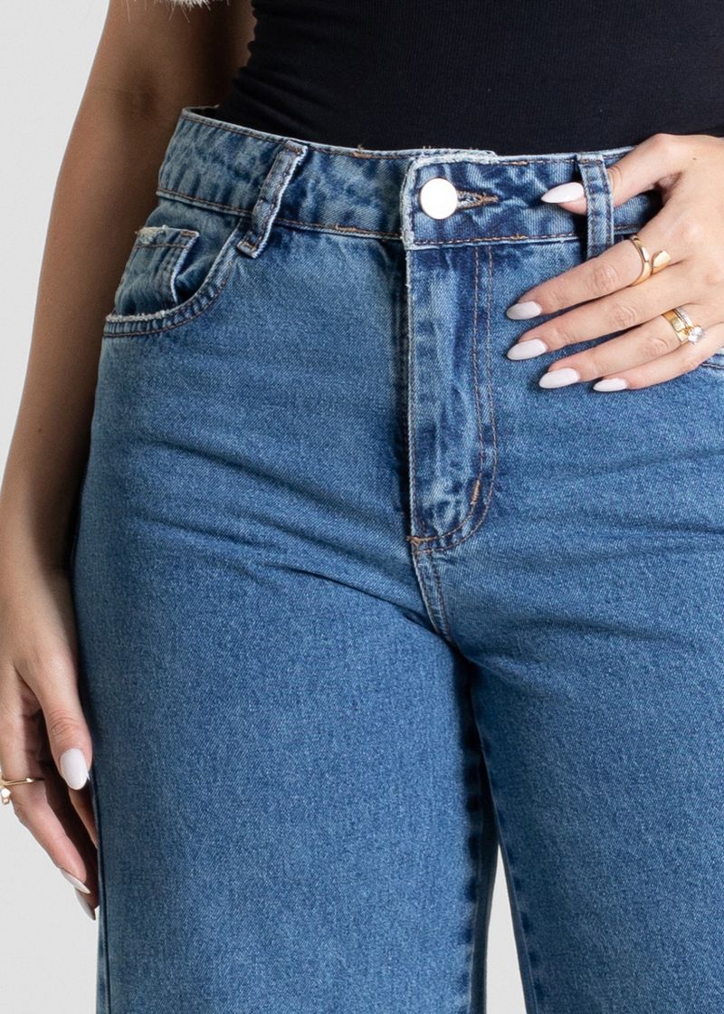 Calça feminina confeccionada em jeans. O modelo possui cintura super alta, gancho no lugar e caimento amplo da coxa até a barra. Cintura alta Fechamento através de um botão e zíper ,Bolsos frontais e posteriores funcionais Barra simples Tecido: Jeans Tipo de Lavagem: Azul Cor: Azul medio