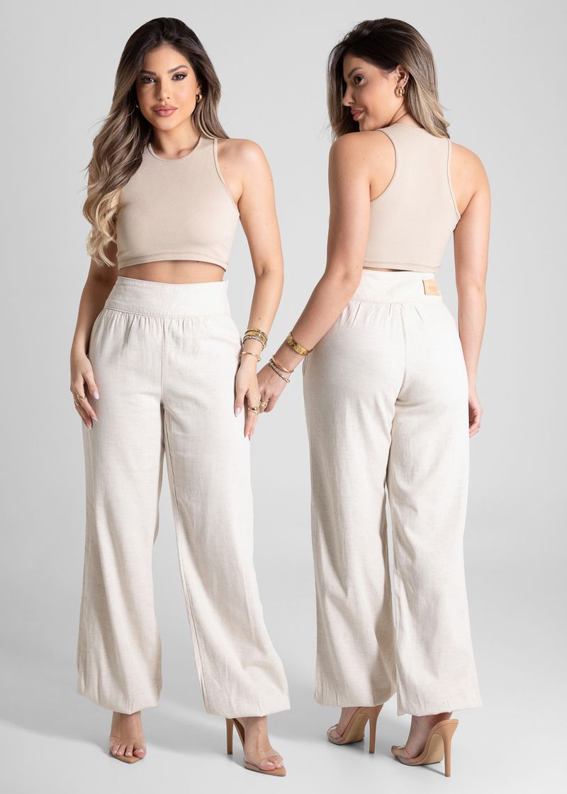 Calça feminina confeccionada em linho. A calça balonê é um modelo caracterizado pelo volume arredondado concentrado na região das pernas, criando uma silhueta ampla e estruturada, que lembra um balão. Cintura alta Fechamento zíper lateral Bolsos frontais e bolsos traseiros funcionais Barra com elástico Tecido: linho Cor: bege