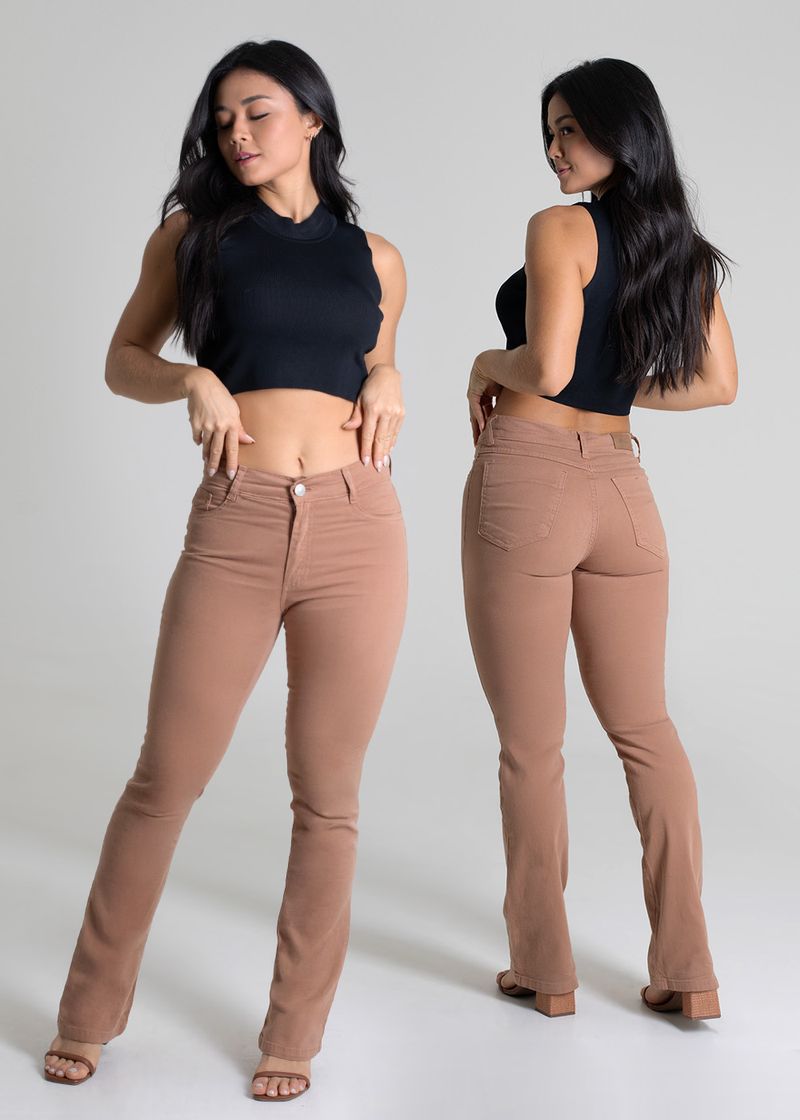 A modelagem tem o caimento ajustado nas pernas e levemente ampla barra. Cintura alta Fechamento com botão e zíper Bolsos frontais falsos e bolsos traseiros funcionais Barra acabamento simples Modelagem: boot cut Tecido: Sarja Tipo de lavagem: Color Cor: marrom