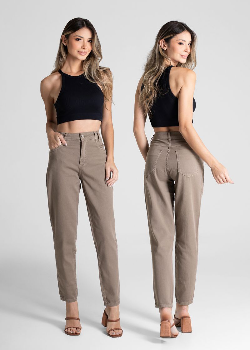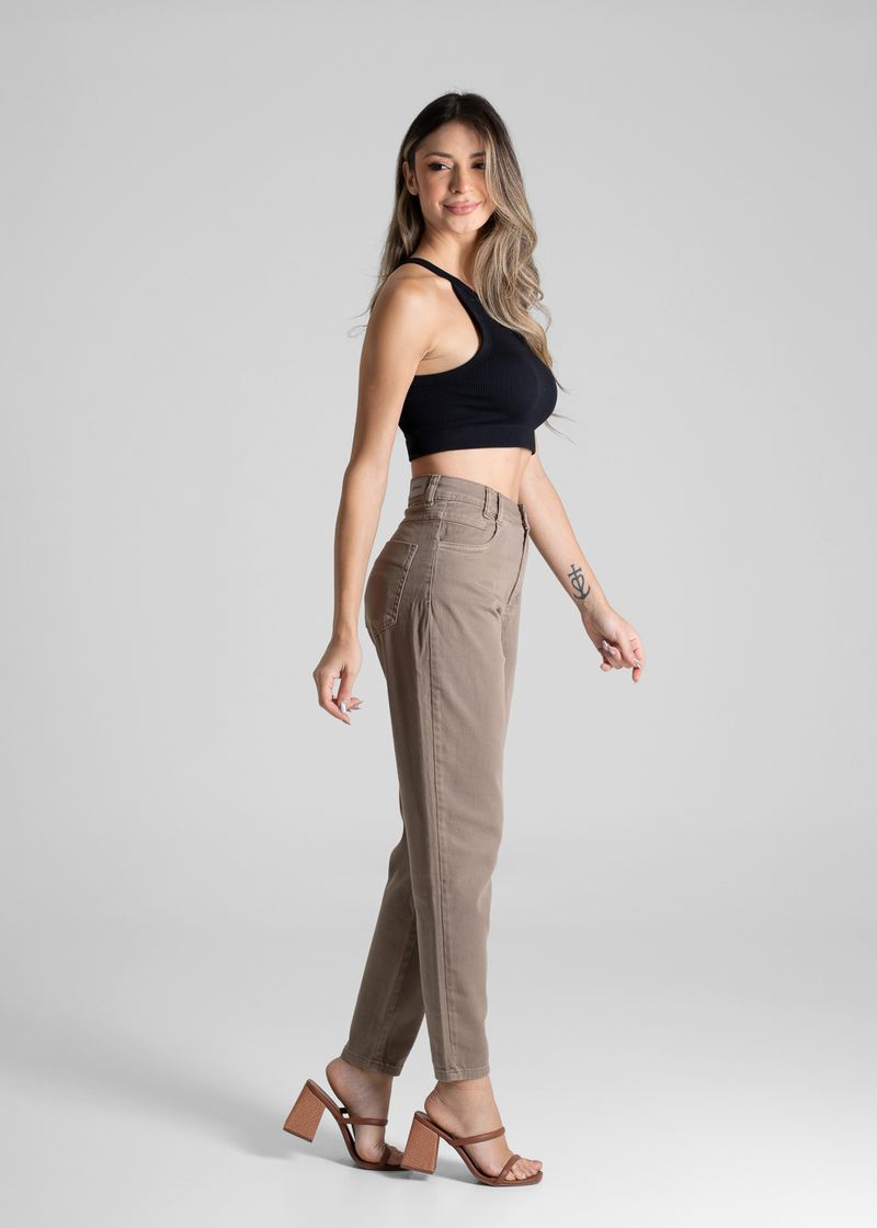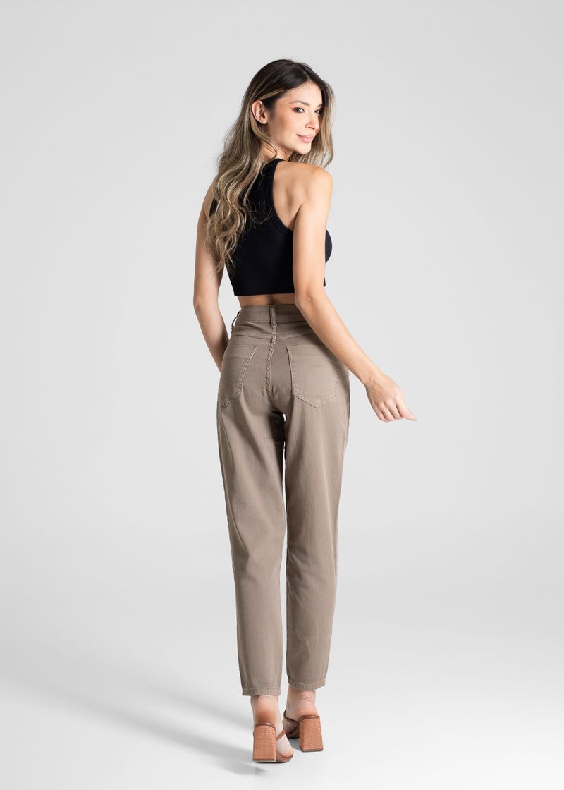 Calça mom confeccionada em sarja. A modelagem mom tem um caimento soltinho nos quadris e coxas ajustando até o tornozelo. Cintura alta Fechamento com botão e zíper Bolsos frontais e bolsos traseiros funcionais Barra simples Modelagem: Mom Tecido: Sarja Tipo de lavagem: Color Cor: caqui