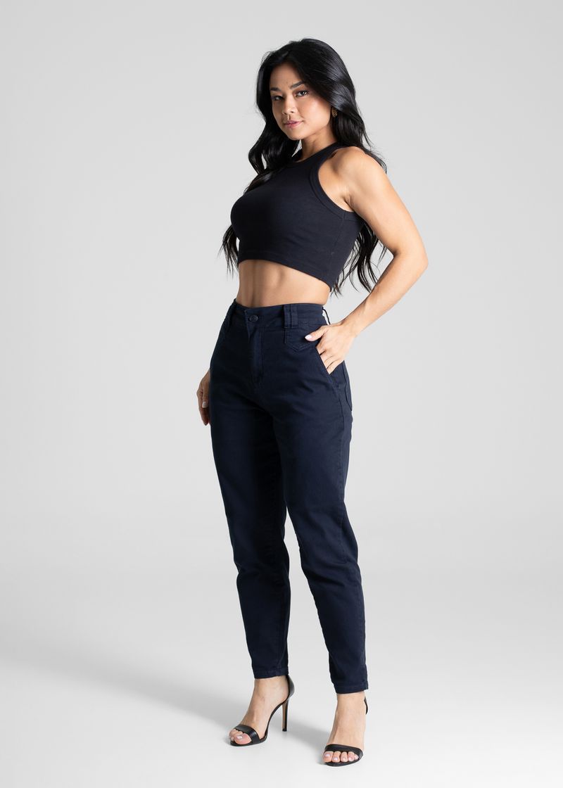 Calça mom confeccionada em sarja. A modelagem mom tem um caimento soltinho nos quadris e coxas ajustando até o tornozelo. Cintura alta Fechamento com botão e zíper Bolsos frontais e bolsos traseiros funcionais Barra simples Modelagem: Mom Tecido: Sarja Tipo de lavagem: Color Cor: marinho