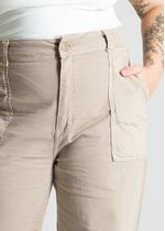 Calça feminina confeccionada em sarja.O modelo pantalona possui cintura alta, gancho no lugar e caimento amplo da coxa até a barra. Cintura alta Bolsos frontais e posteriores funcionais Barra simples Tecido: sarja Tipo de Lavagem: color Cor:caqui escuro