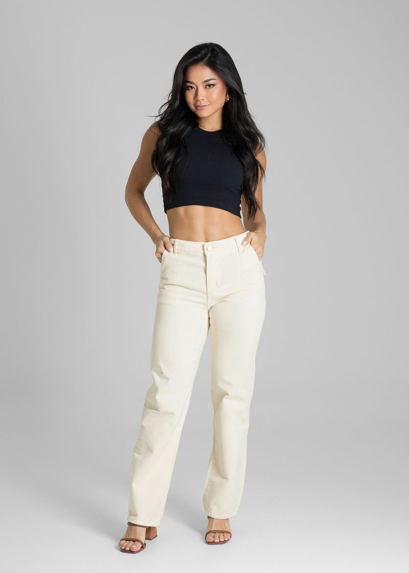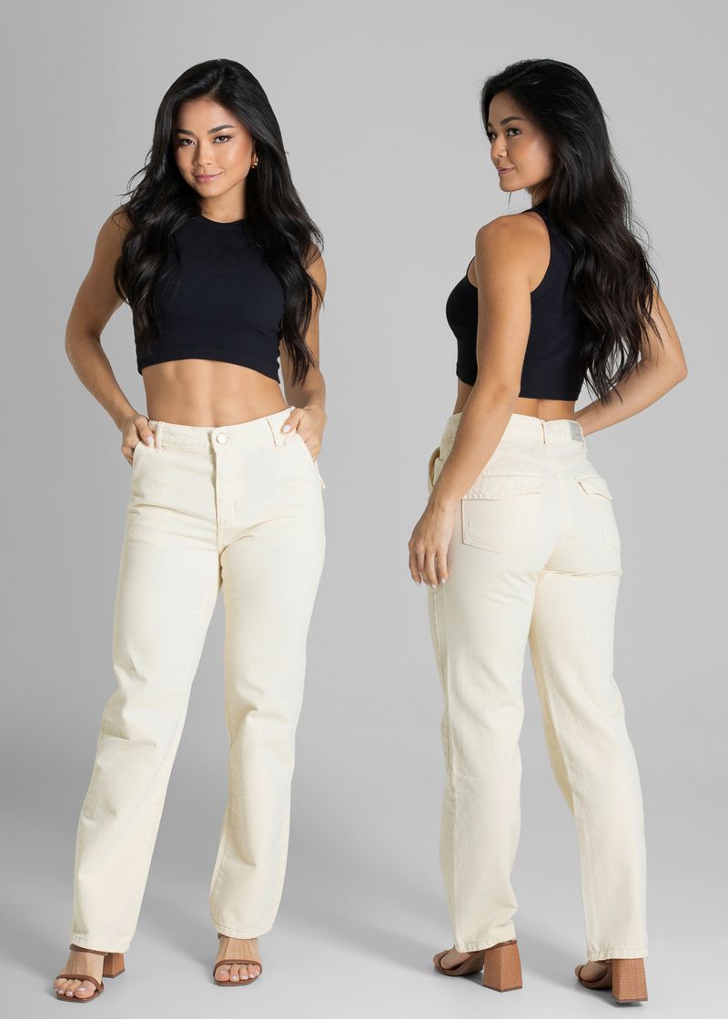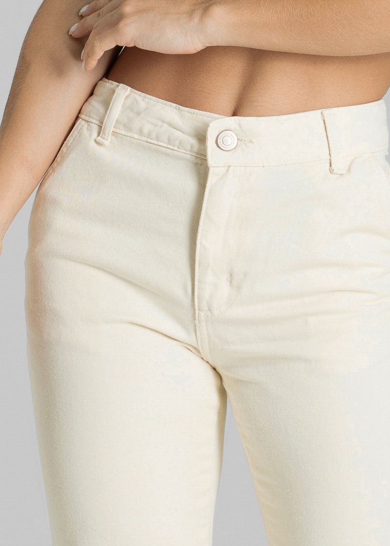 Calça sarja feminina de modelagem reta, com caimento mais solto ao corpo. Cintura alta Fechamento com botão e zíper Bolsos frontais falsos e bolsos traseiros funcionais Barra simples Tecido: Sarja Tipo de lavagem: Color Cor: amarelo