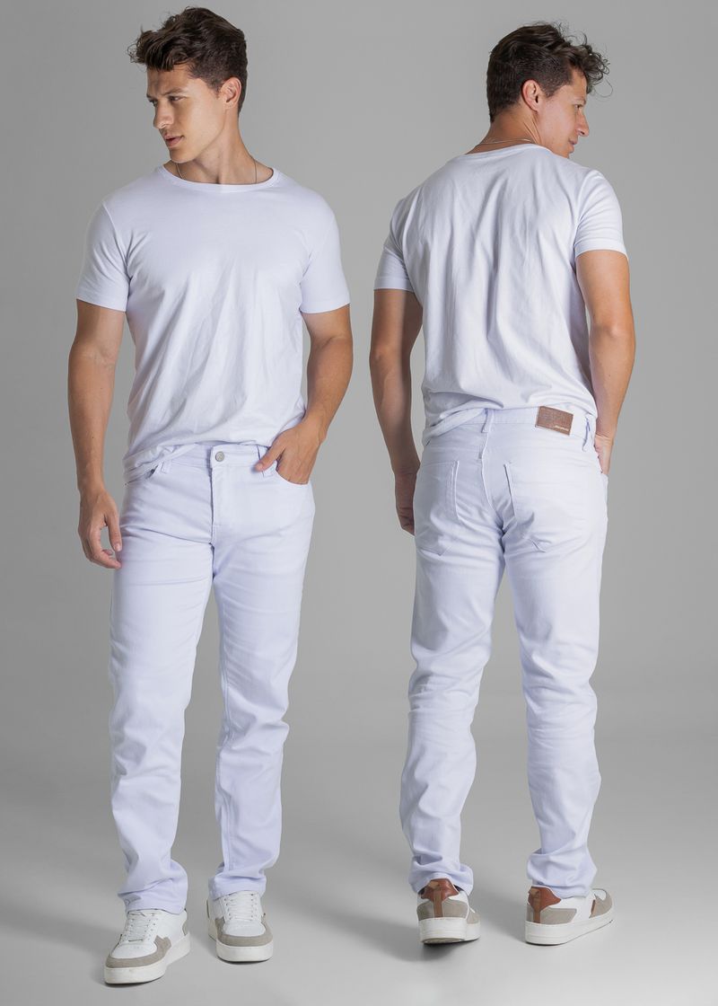 Calça skinny confeccionada em sarja. Modelagem ajustada até a barra. Cintura média Fechamento com botão metálico e zíper Bolsos frontais e bolsos traseiros funcionais Barra simples Modelagem: Men skinny Tecido: Sarja Tipo de lavagem: Color Cor: branco
